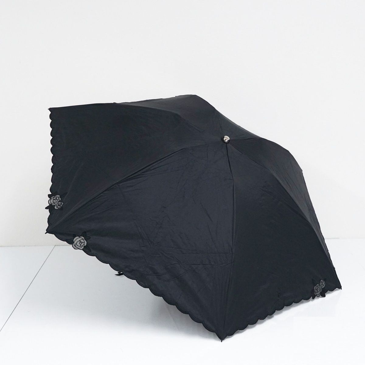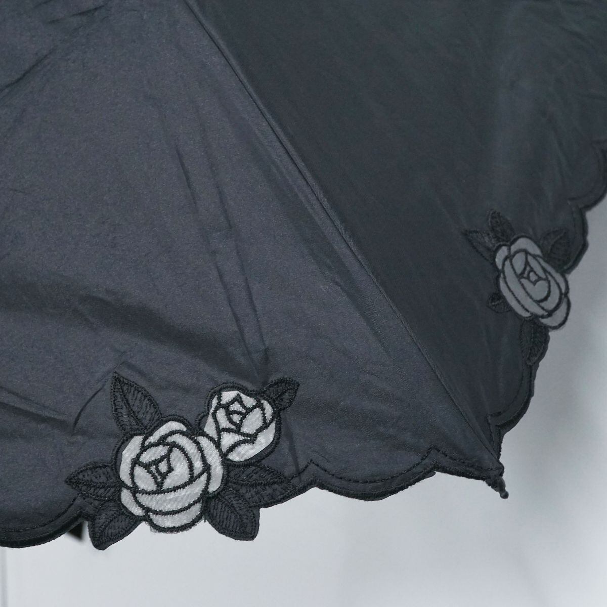 生地のフチのスカラップデザインと、フラワー刺繍がエレガントな雰囲気のパラソルです。