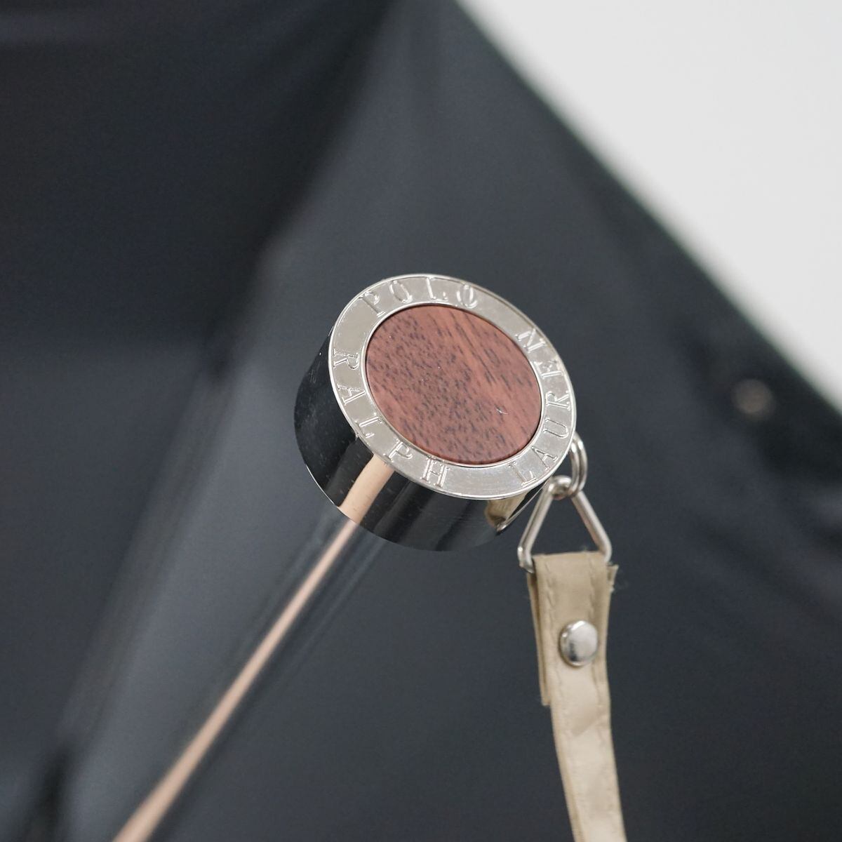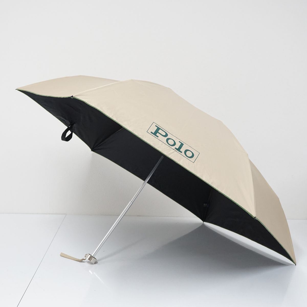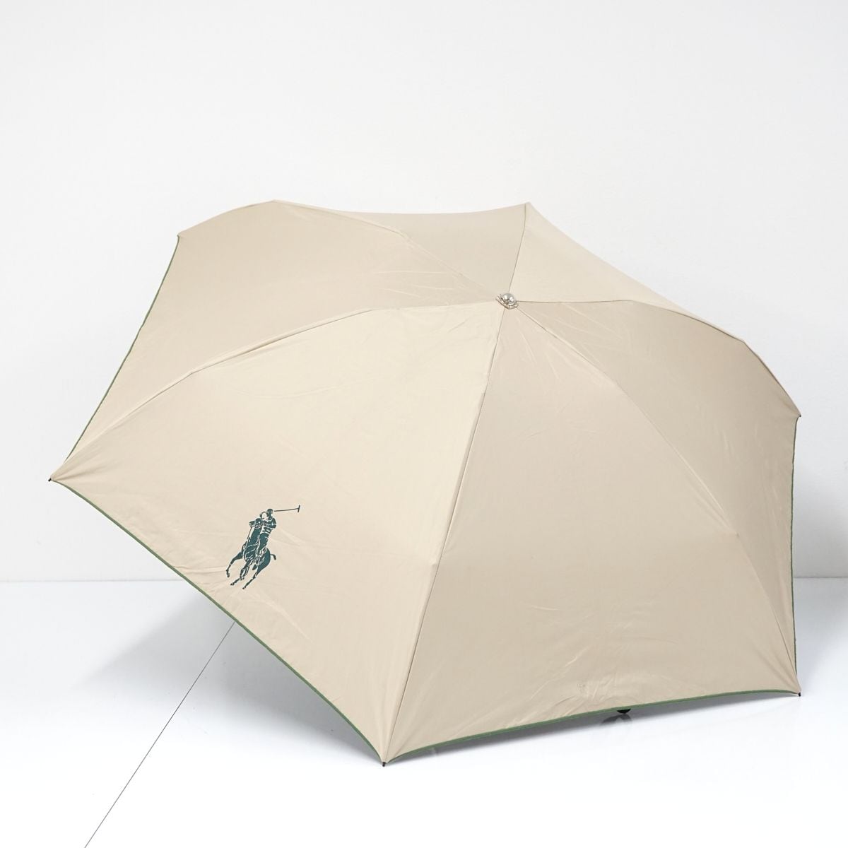 ライトベージュの生地にポロポニーとロゴをプリントしたシンプルなデザインの折り畳みパラソルです。