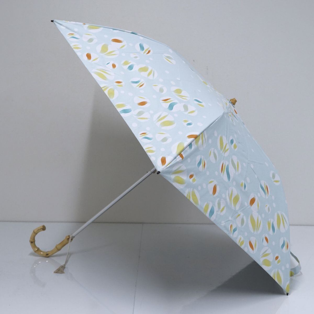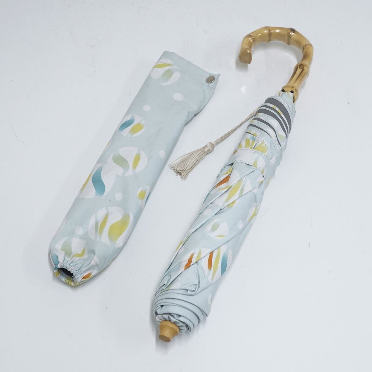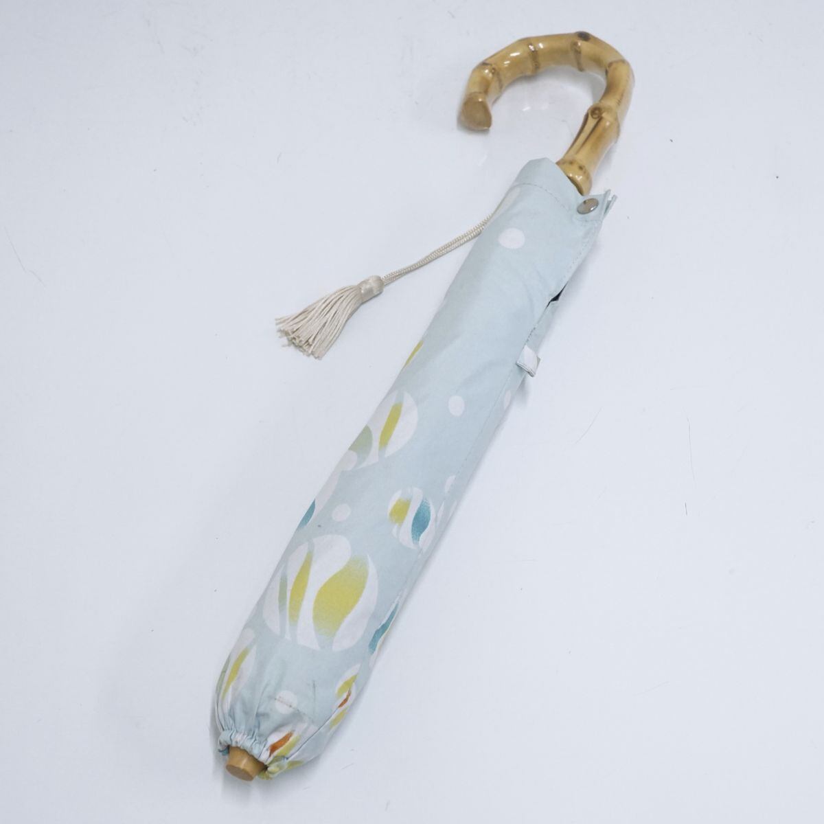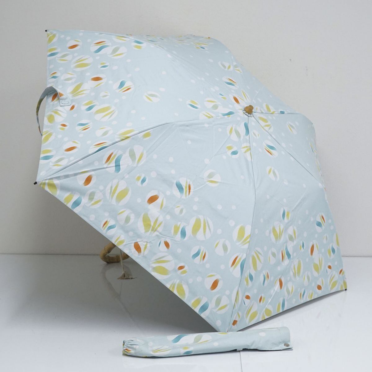 折りたたみ日傘 河馬印本舗 USED美品 晴雨兼用 ビー玉 白藍 ブルー系 和風 タッセル 収納袋付 UPF50+ 遮光 UV 50cm FA8652