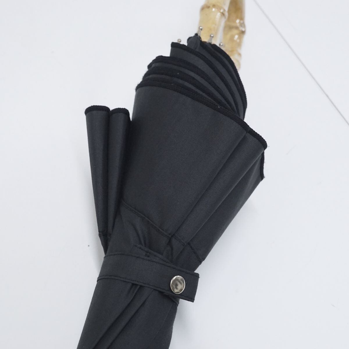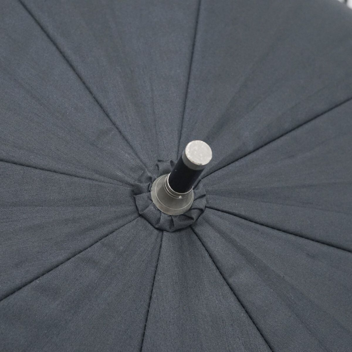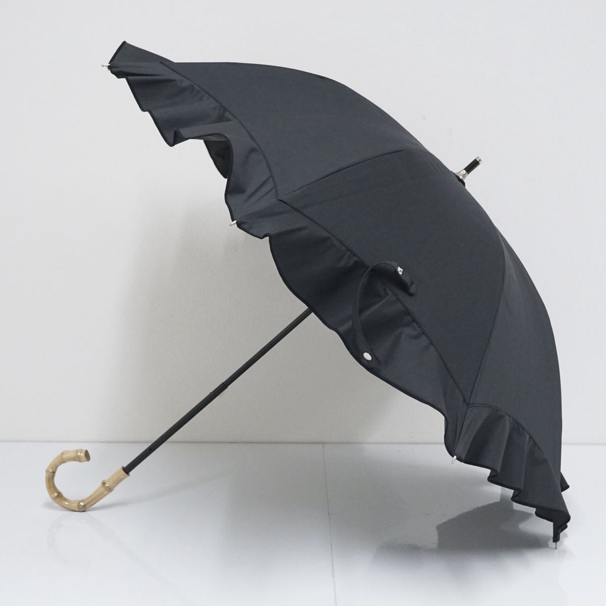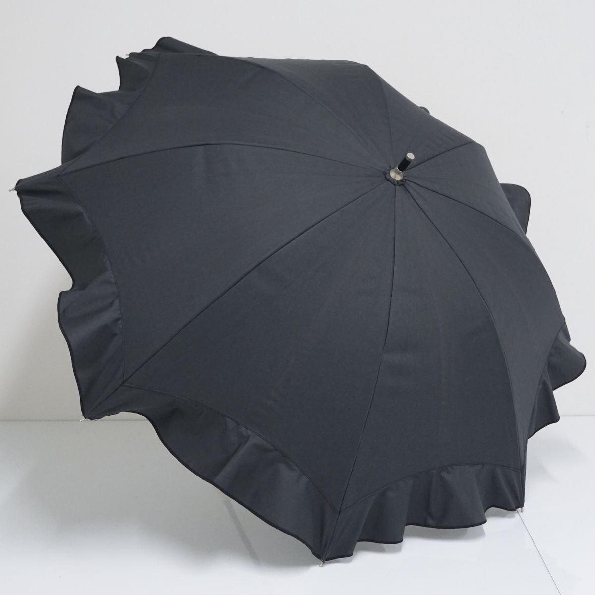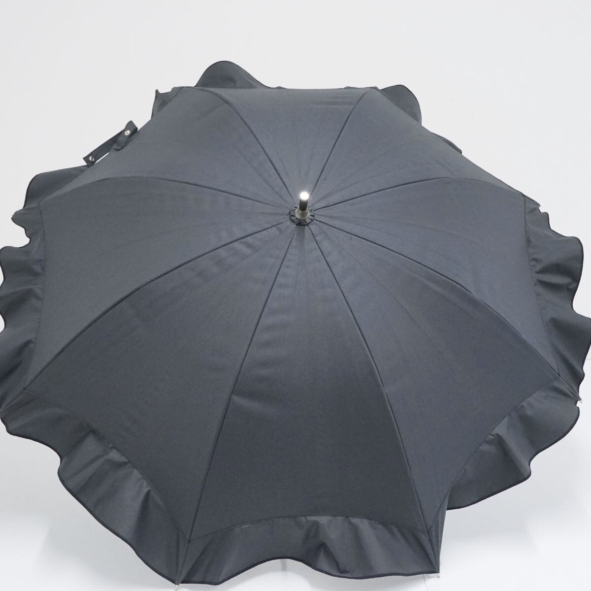 ブラックの生地にラッフルフリルがかわいい晴雨兼用日傘です。