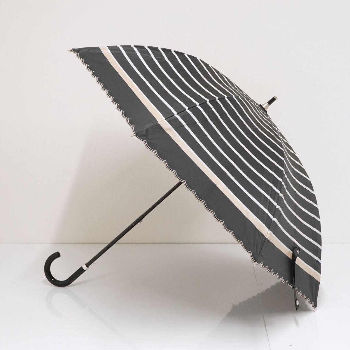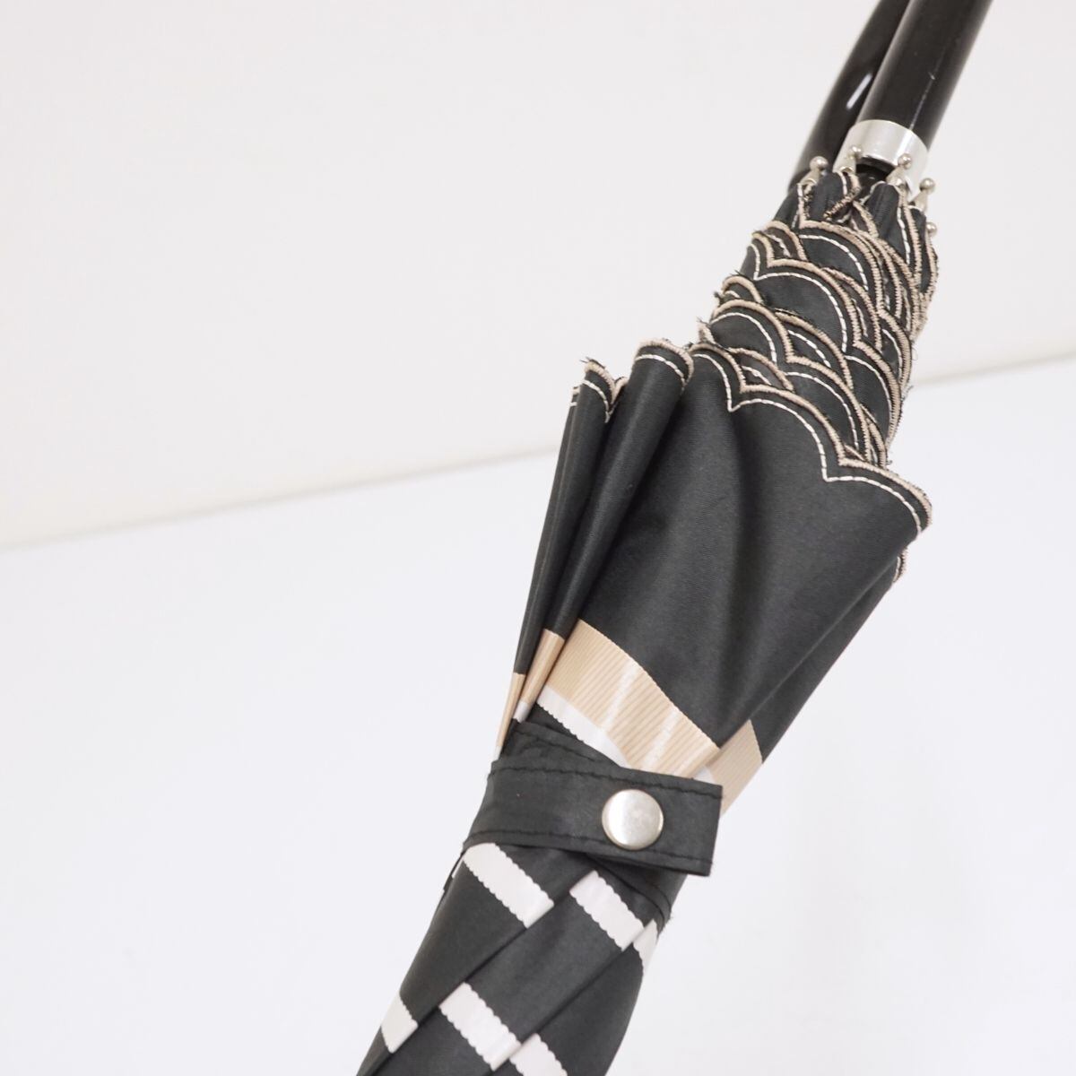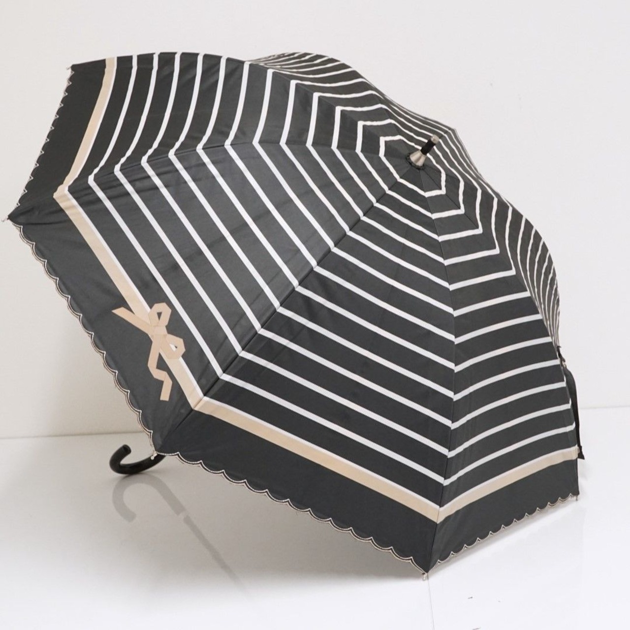 日傘 晴雨兼用 LANVIN en Bleu ランバンオンブルー USED美品 リボン スカラップ ボーダー ブラック 遮光 遮熱 UV 50cm A1354