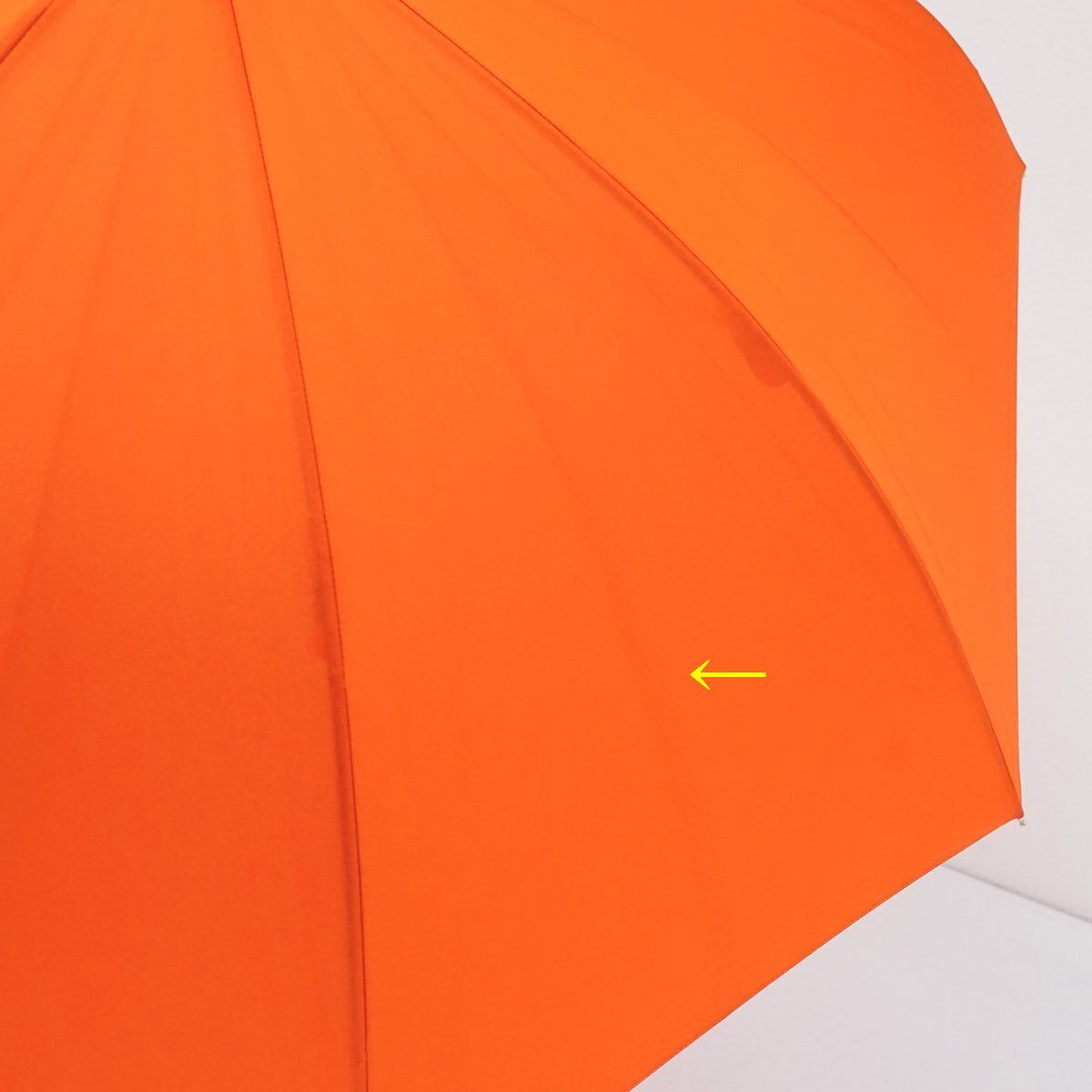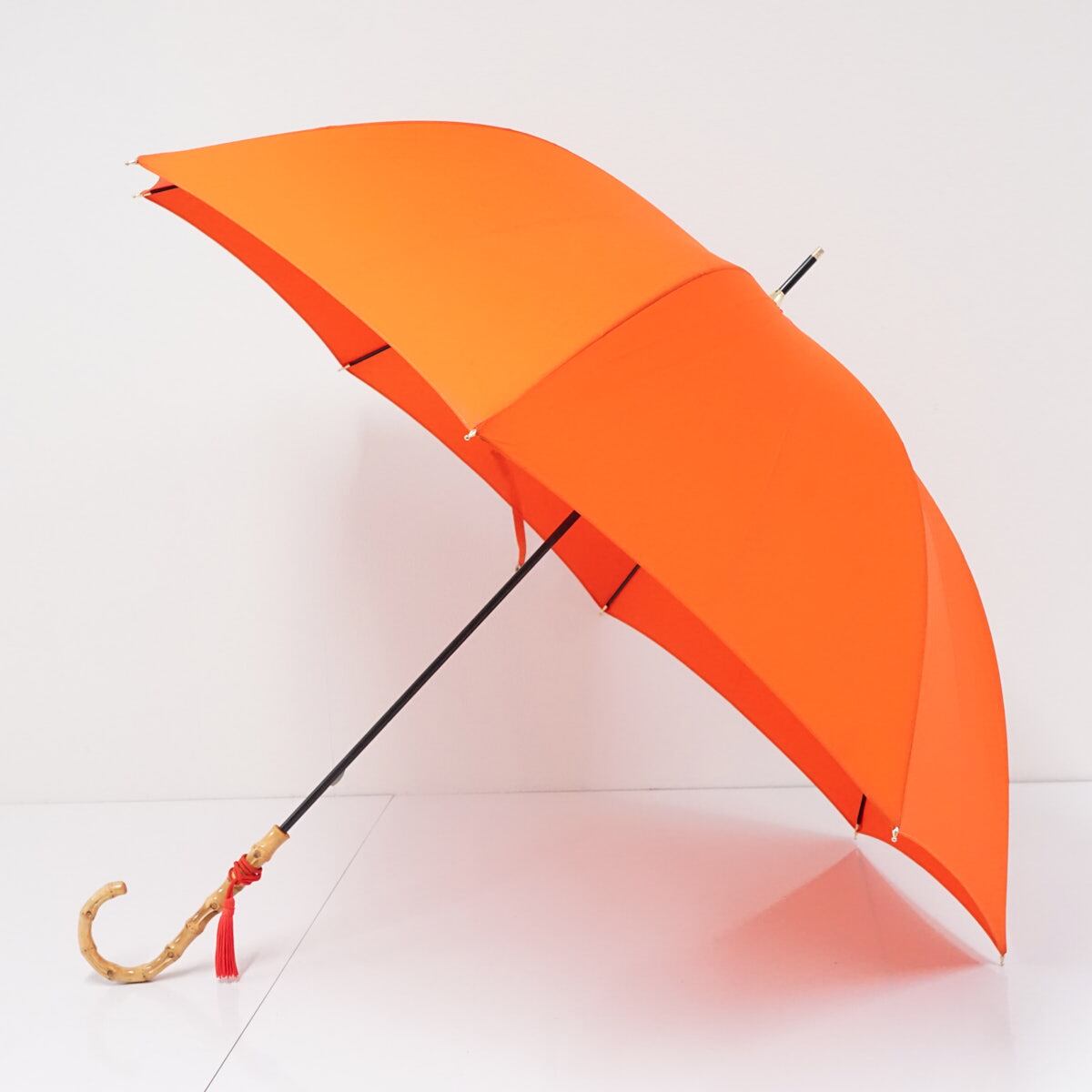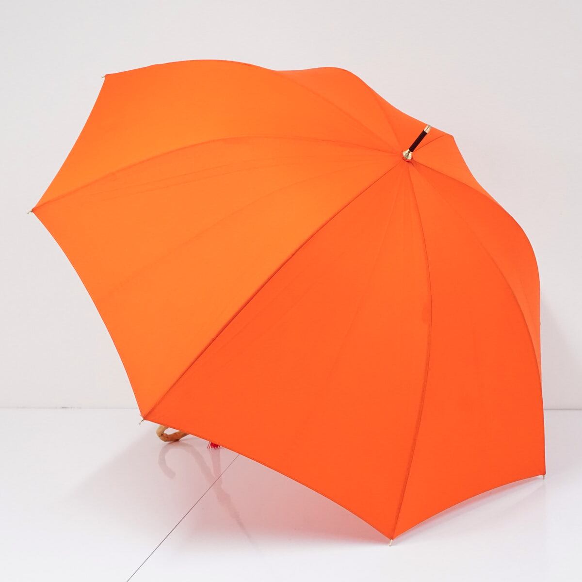 鮮やかなオレンジ系の生地を使用したシンプルデザインの傘です。