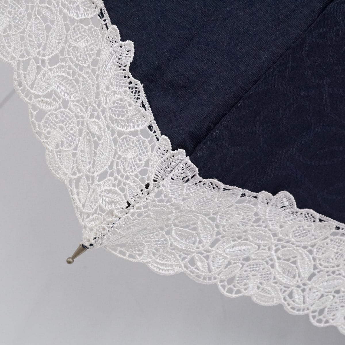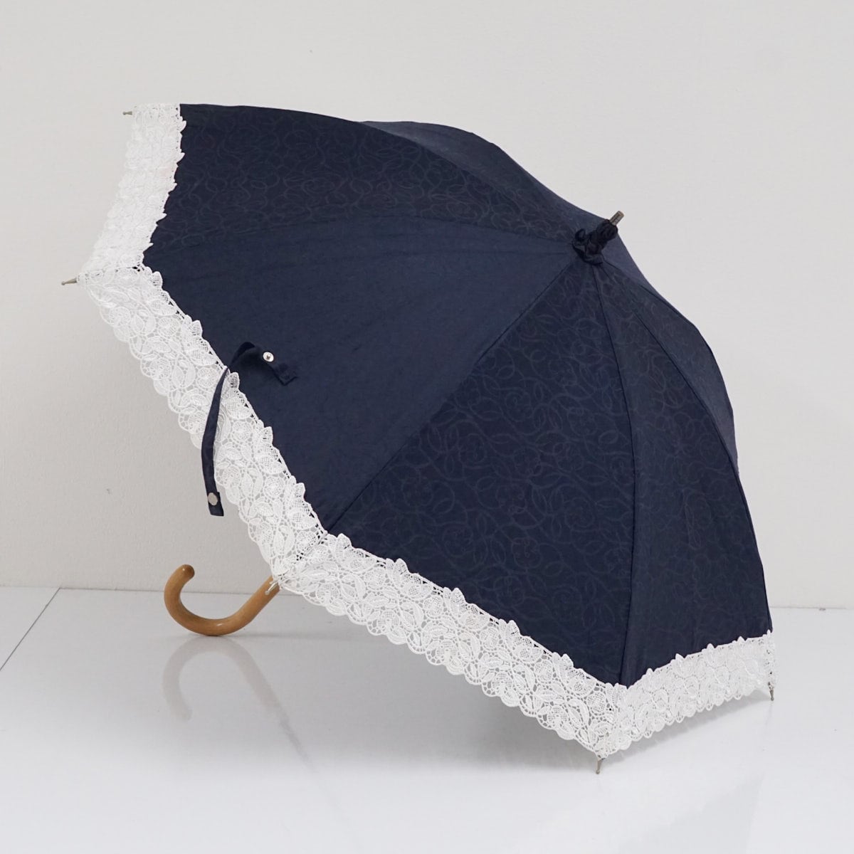 ネイビーの生地にフラワーのシルエットがエレガントで、外周はフラワーチュールレースで涼し気に仕上げています。