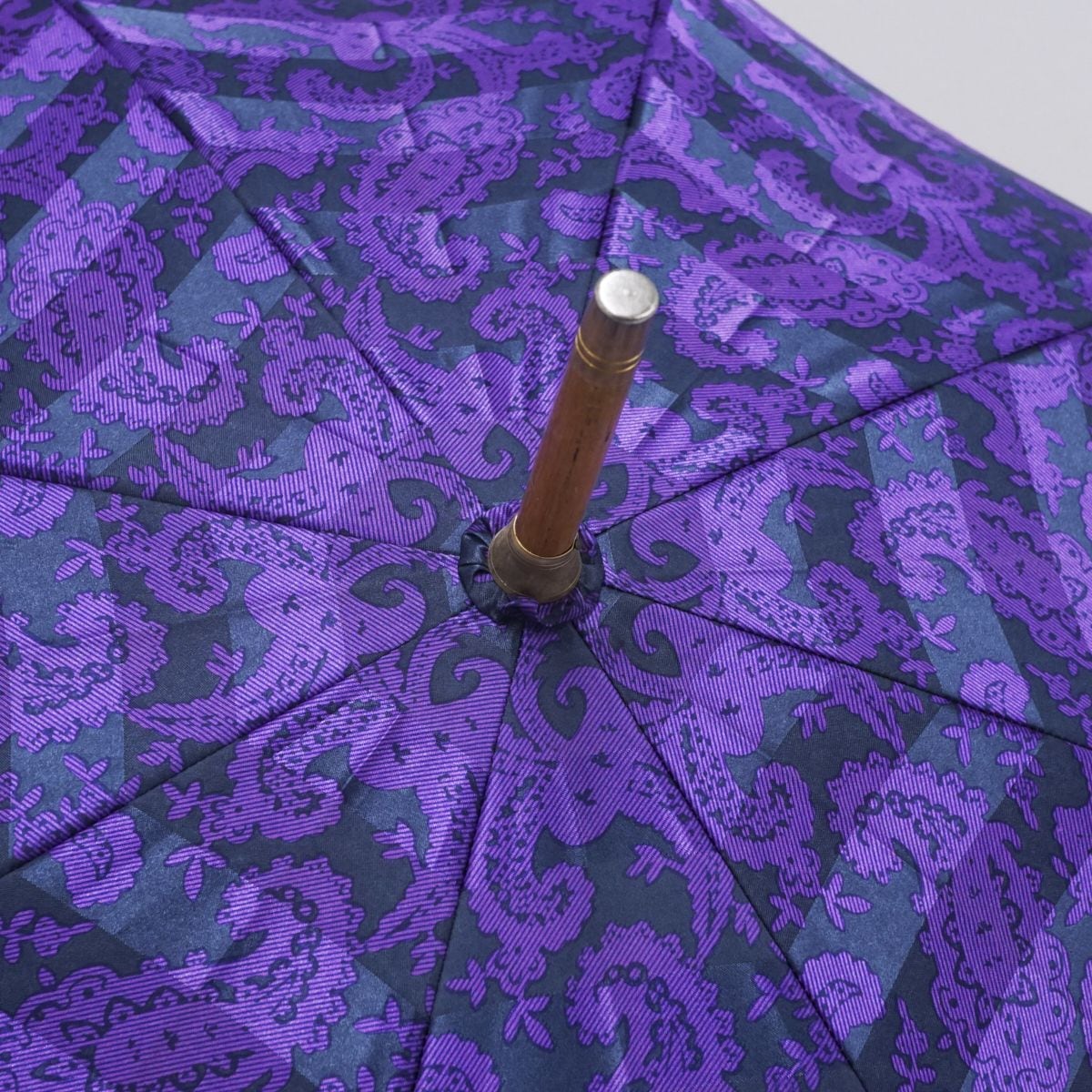 光沢のあるパープルとブラックの生地にペイズリー柄のようなデザインが個性的で高級感溢れる仕上がりです。