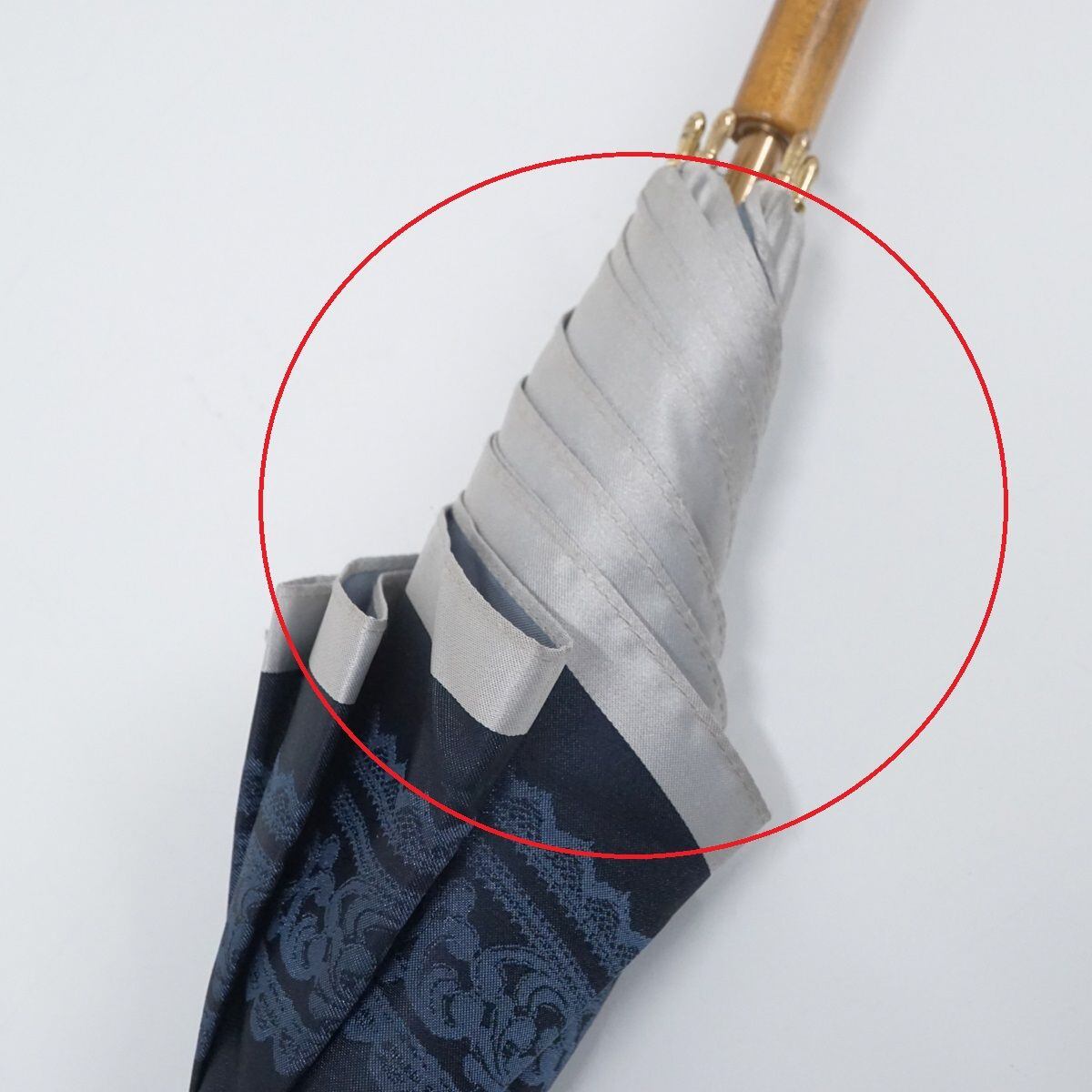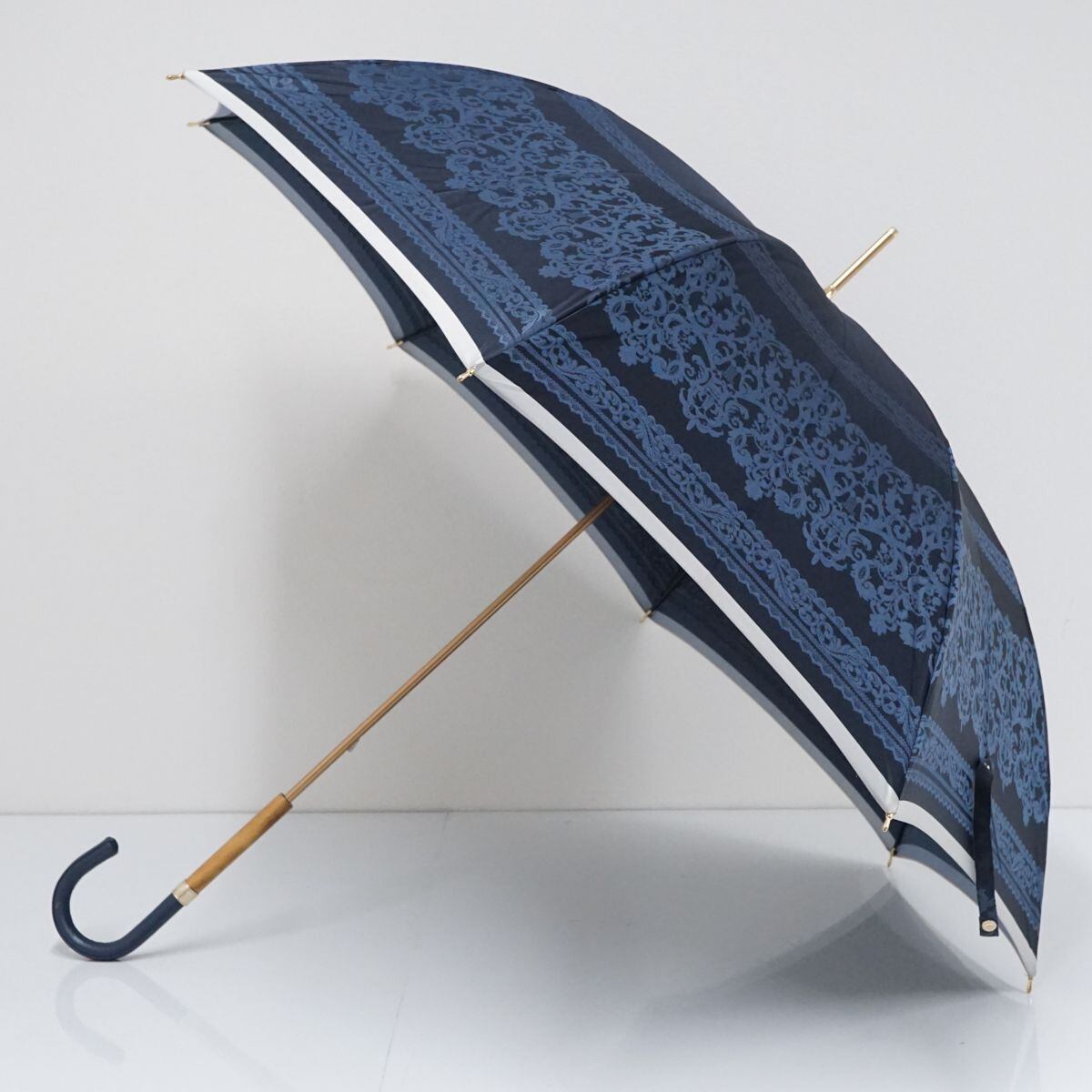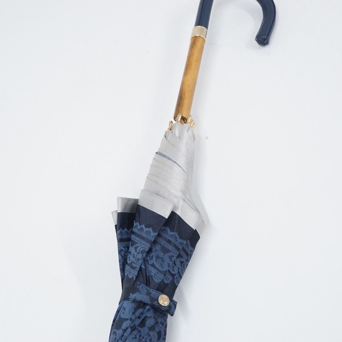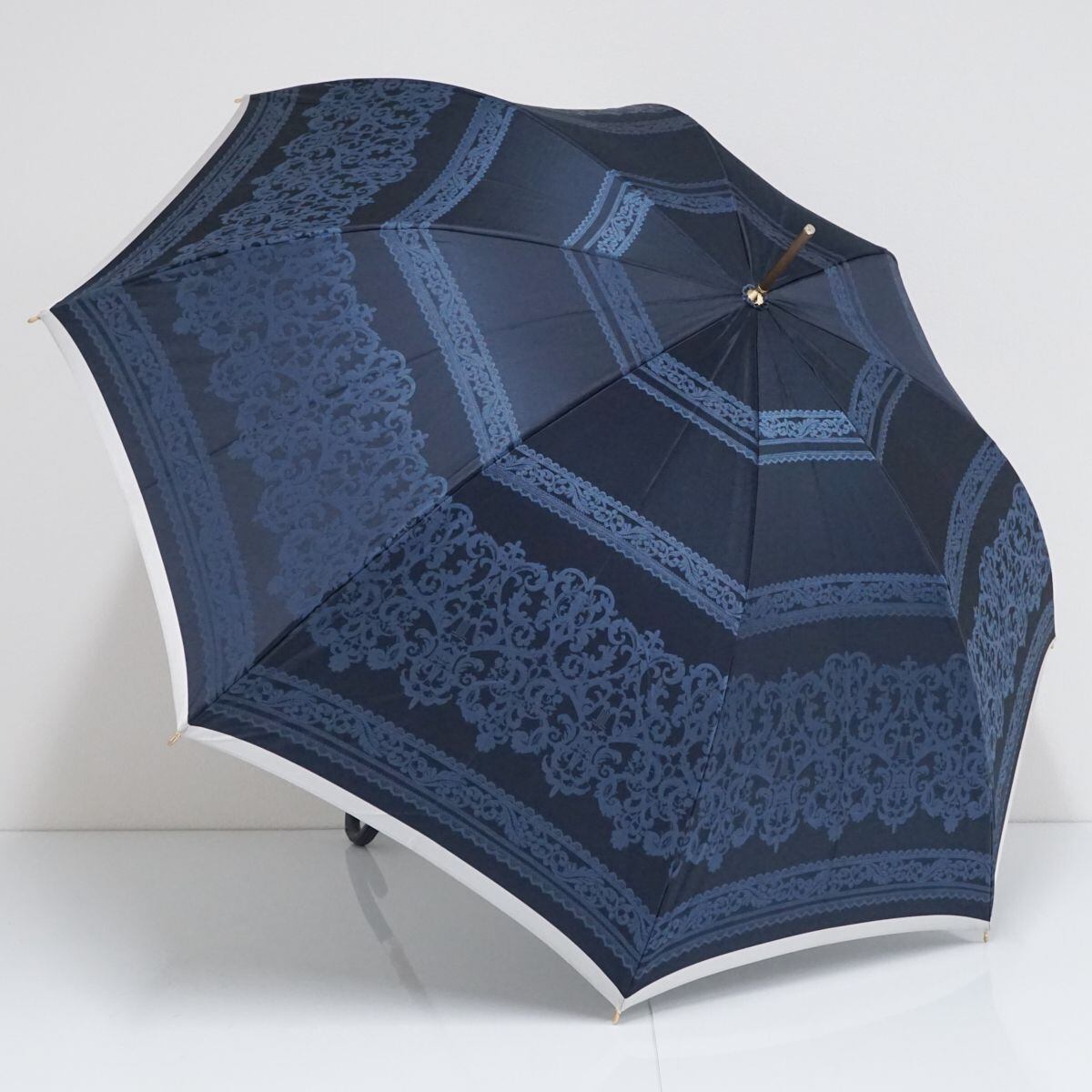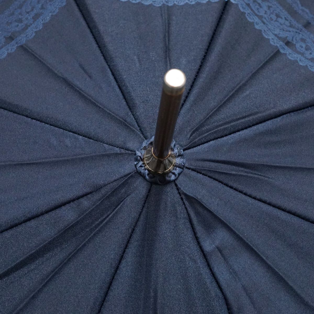 上品な光沢のあるネイビー系の生地にレース柄がゴージャスでシックなラグジュアリーなデザインの傘です。