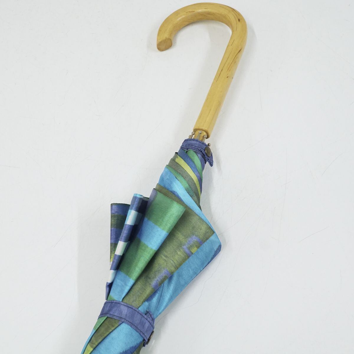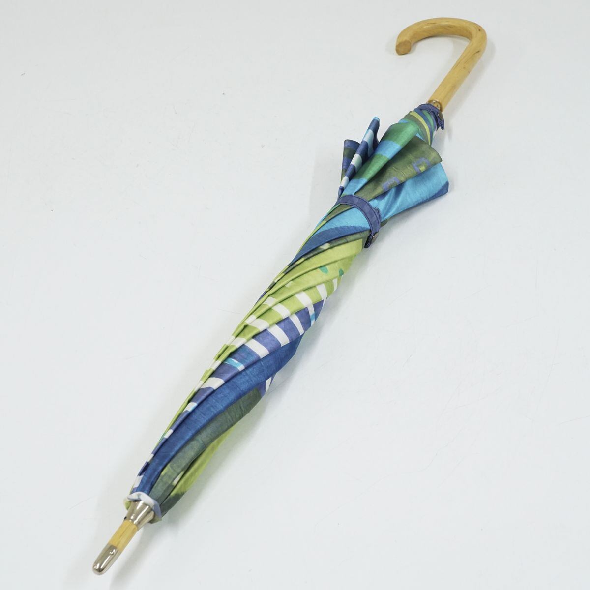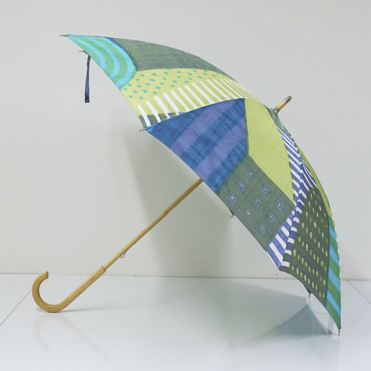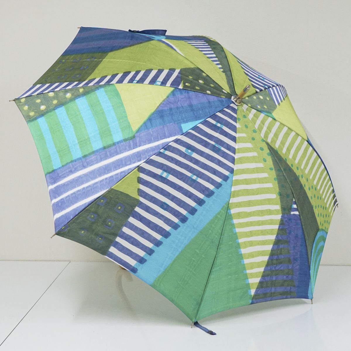日本製高級傘 USED美品 グリーン ブルー アート レディース 高級 テキスタイル グラス骨 日本製 55cm A1410