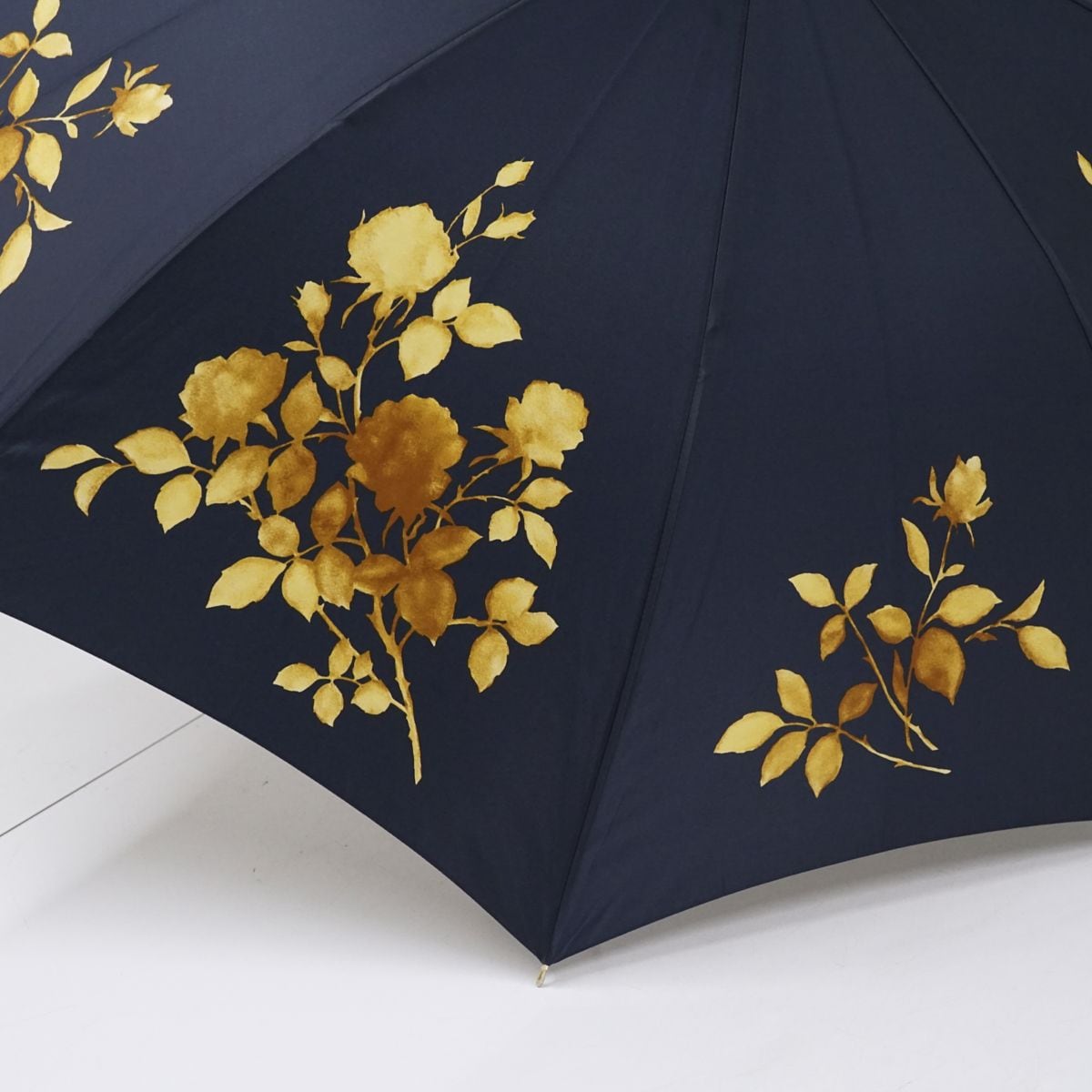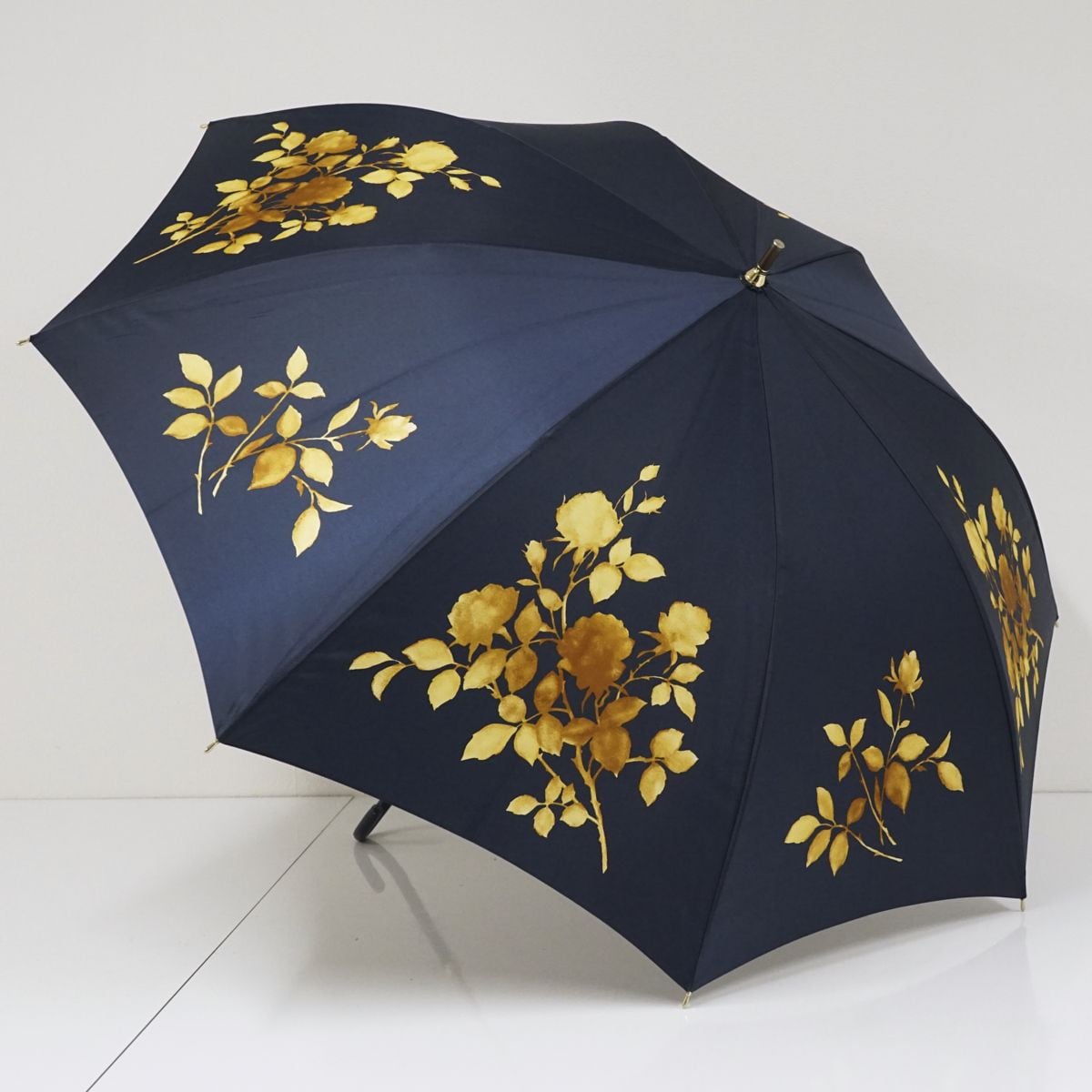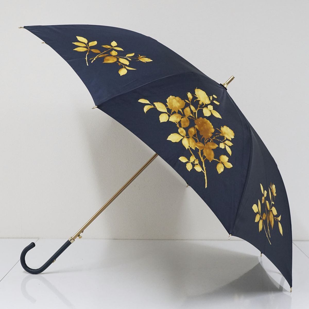 ネイビーの生地に山吹色のフラワープリントが上品な一品です。