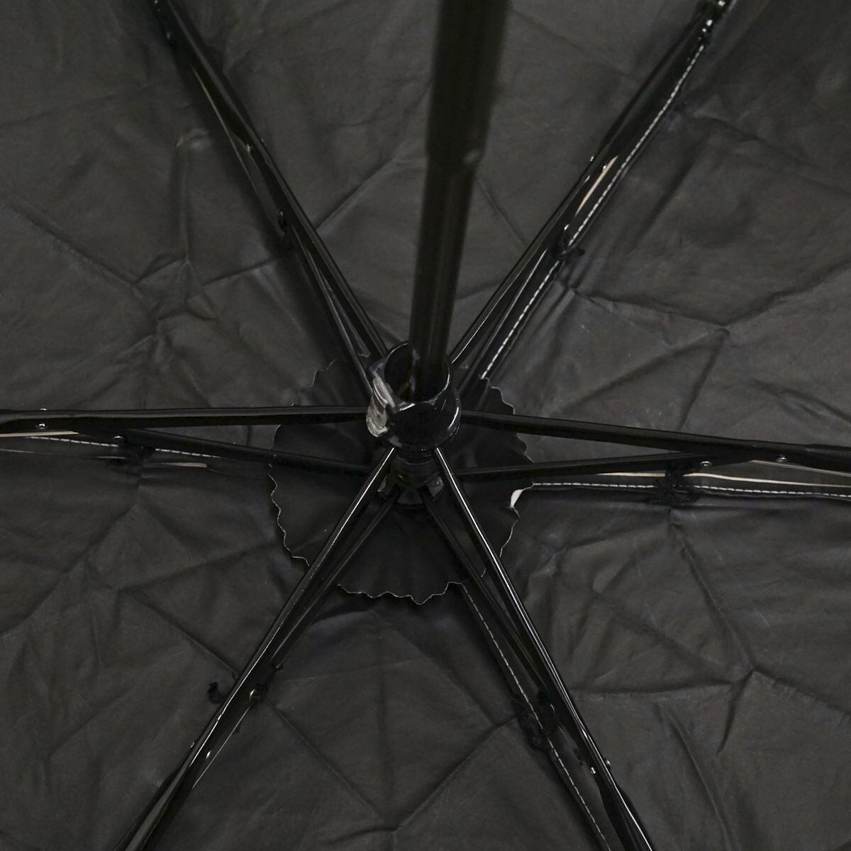 ベージュの生地いっぱいにロゴをデザインしたブランド感のあるデザインの折り畳みパラソルです。
