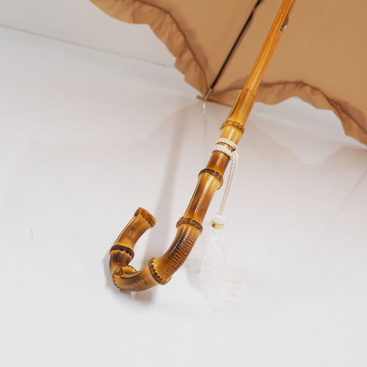 焼き入れされた寒竹の手元にはホワイトのレースタッセルが揺れ、優美な仕上がりです。