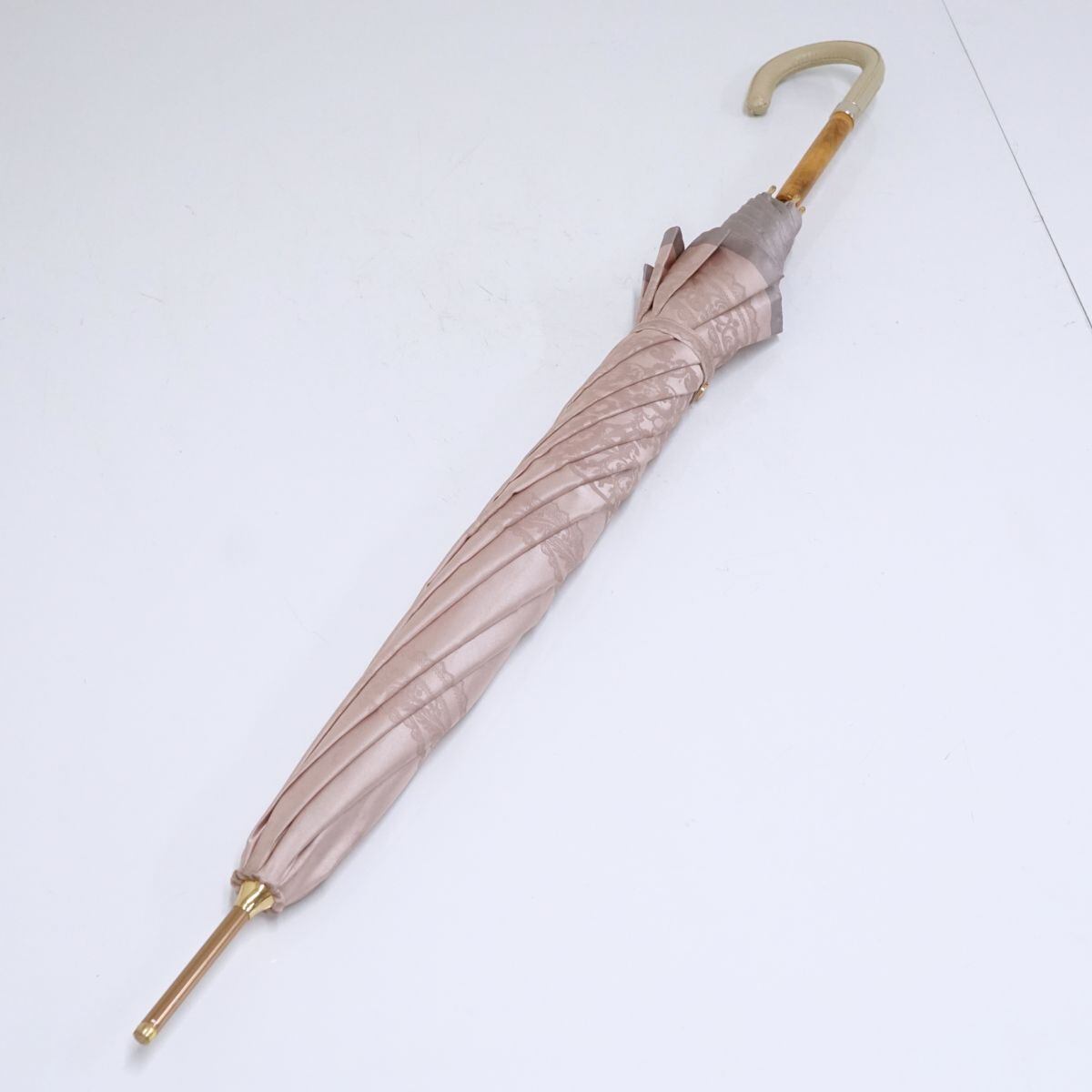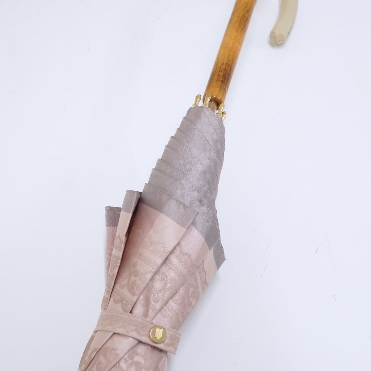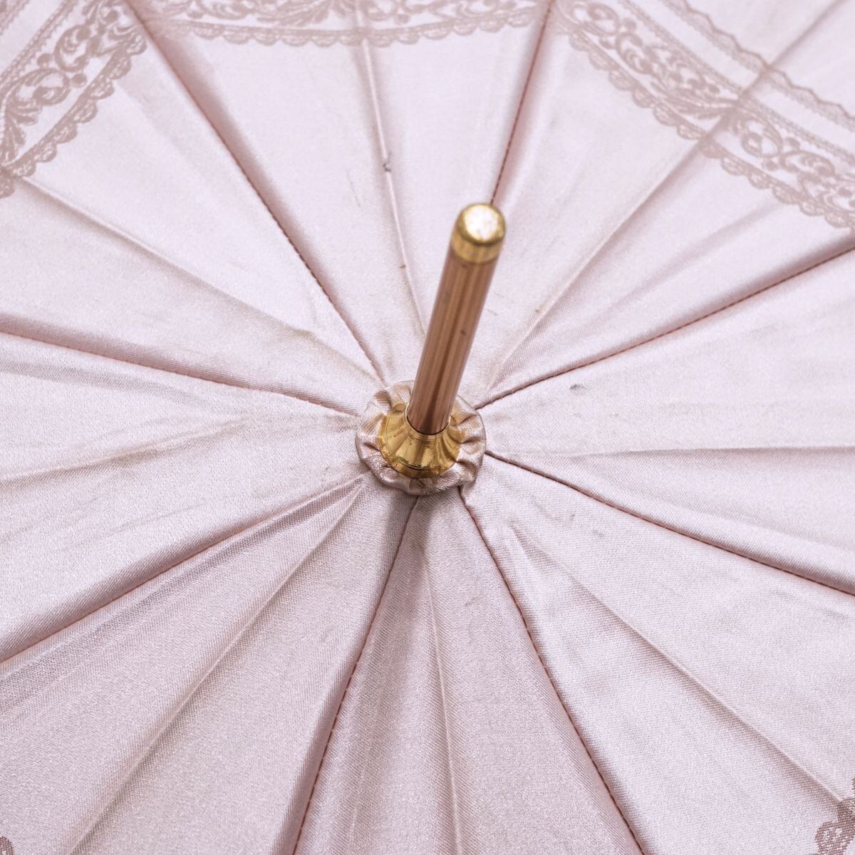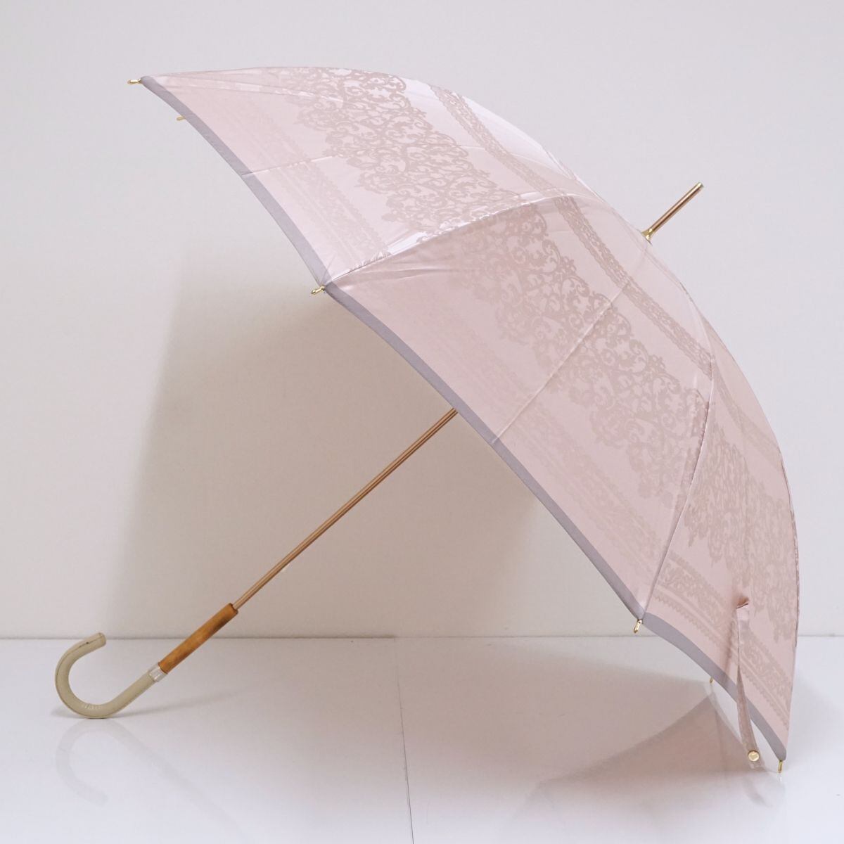 上品な光沢のある淡いピンクの生地にレース柄がゴージャスでシックなラグジュアリーデザインの傘です。