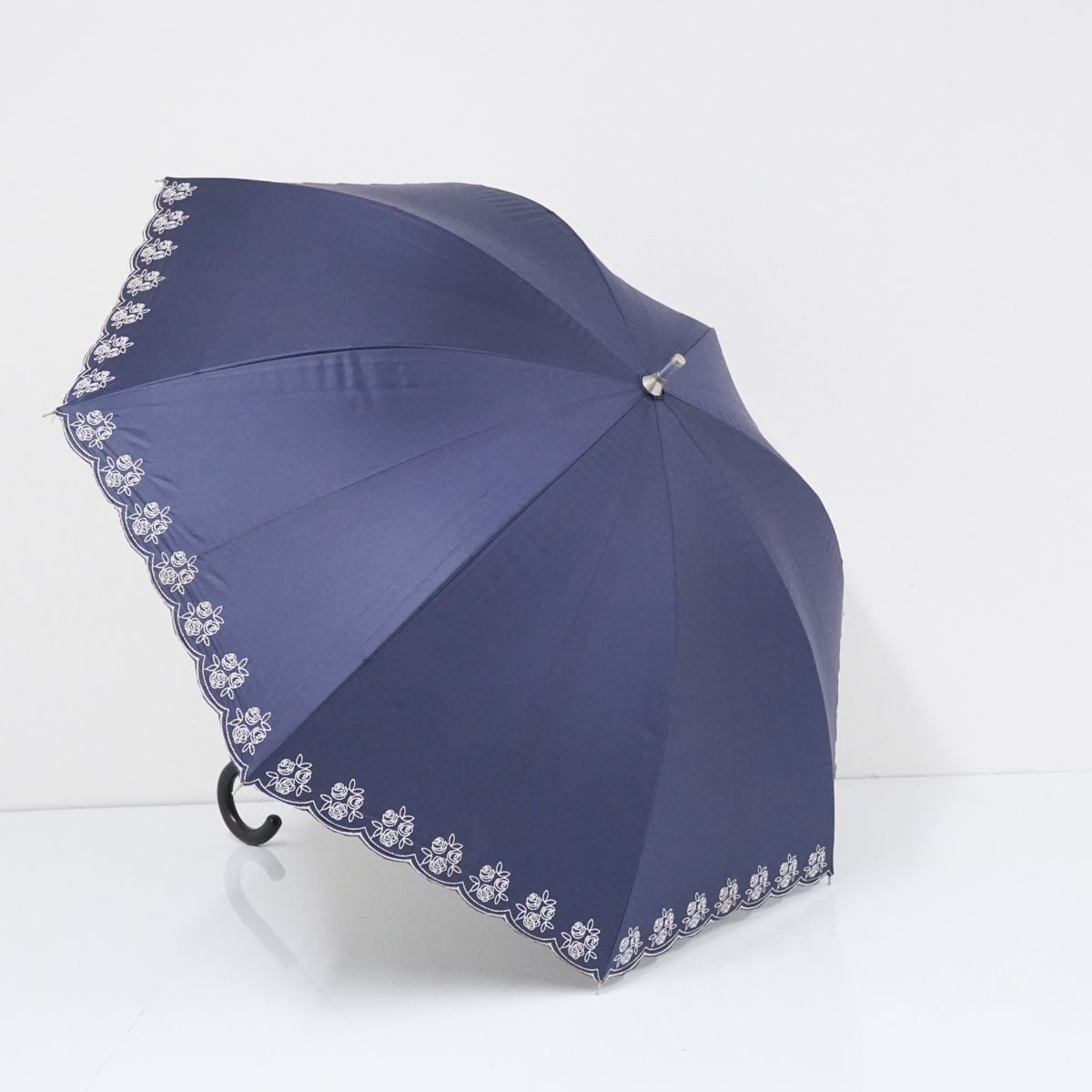 ネイビーの生地にスカラップフリルの刺繍した可愛いデザインの晴雨兼用の日傘です。