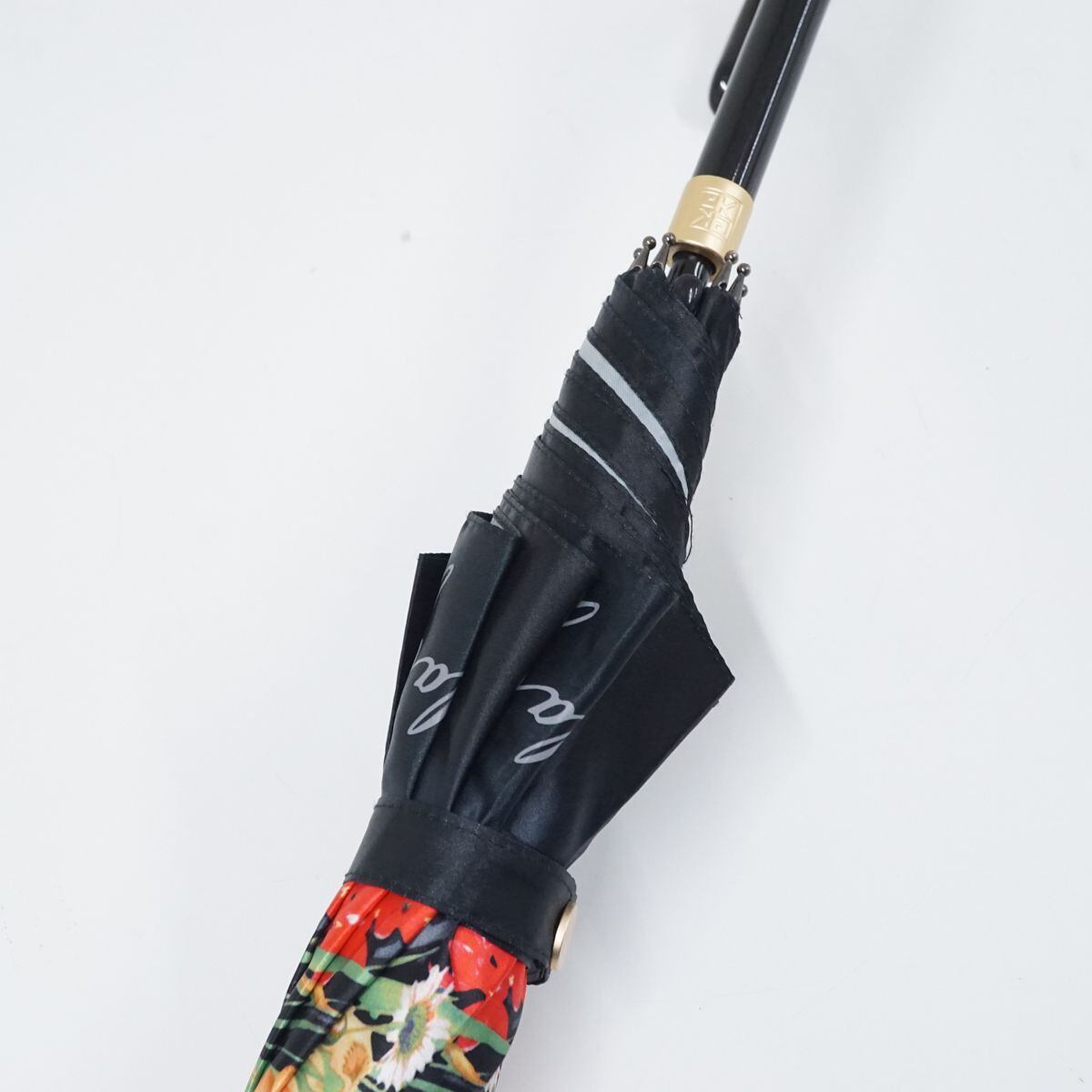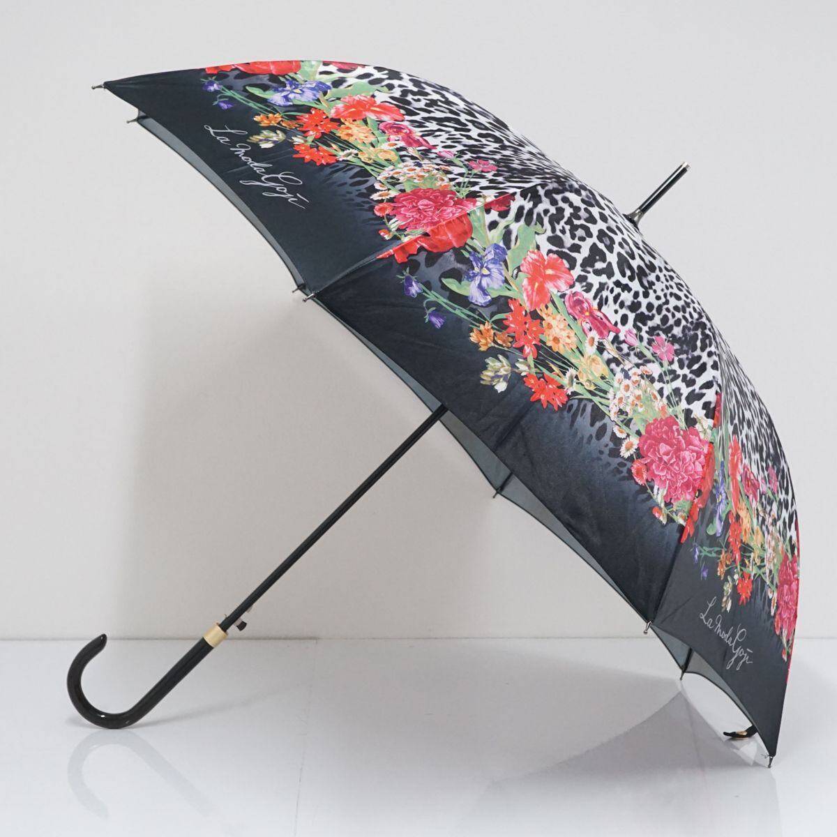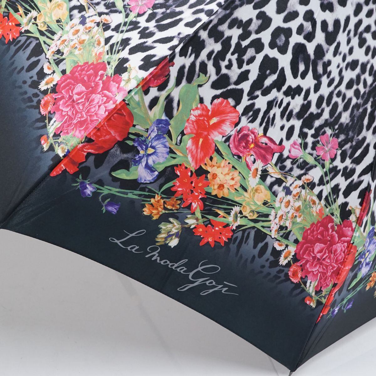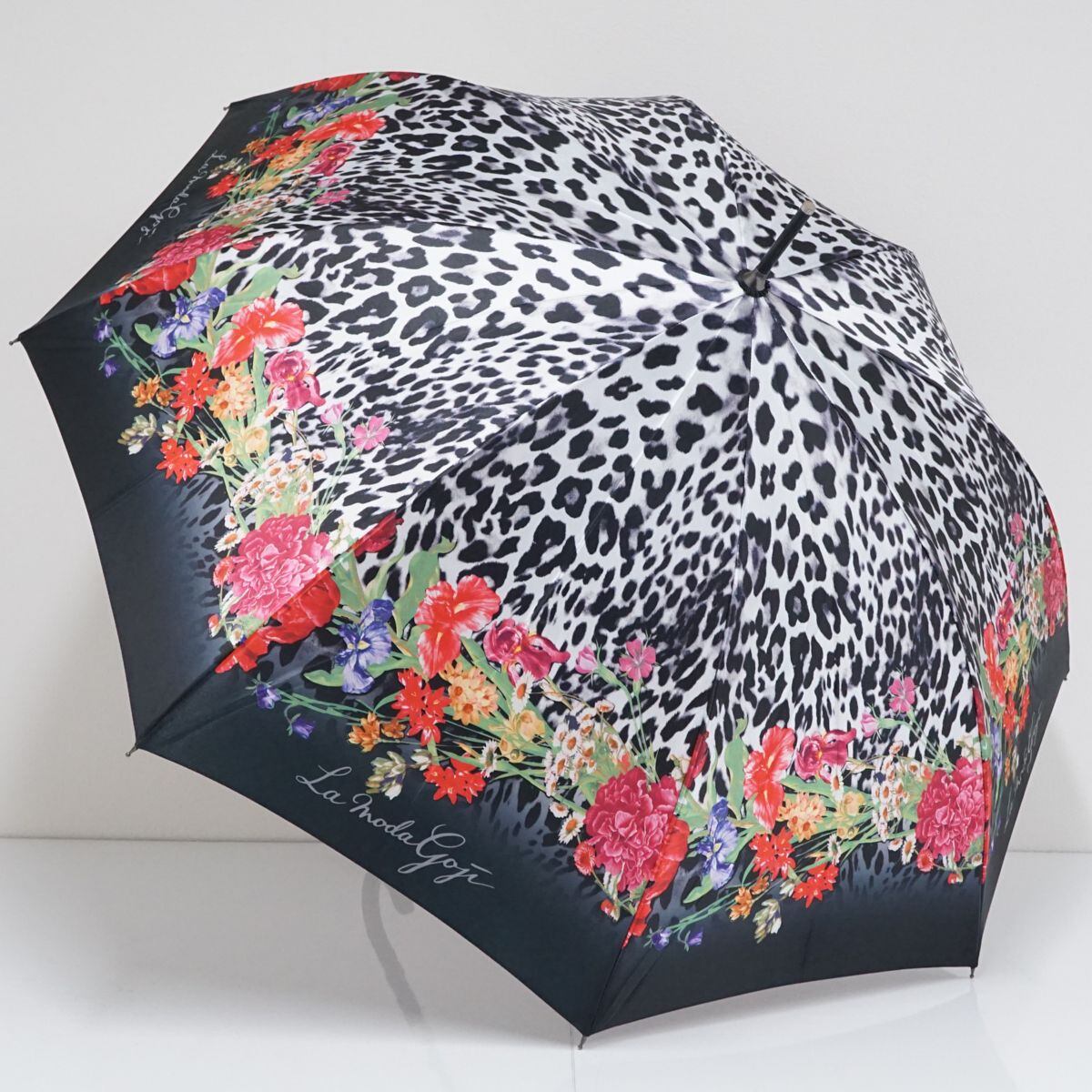 高級傘 La Moda GOJI ラ モーダ ゴジ USED美品 レディース 雨傘 伊太利屋 ブラック ヒョウ柄 レオパード 花柄 ジャンプ 60cm S1568