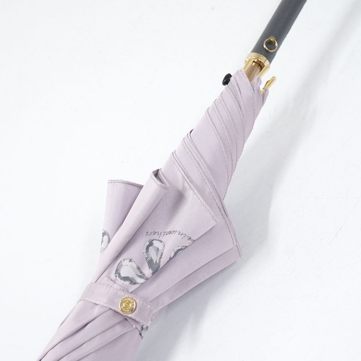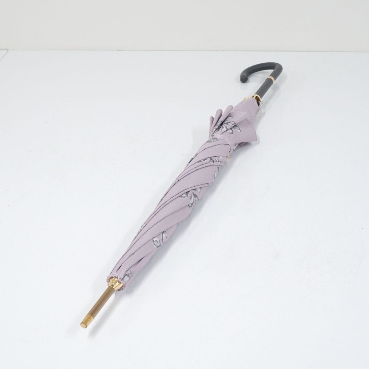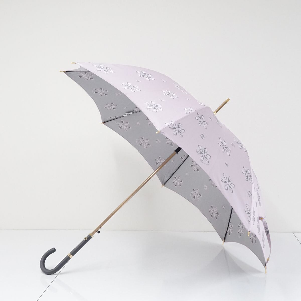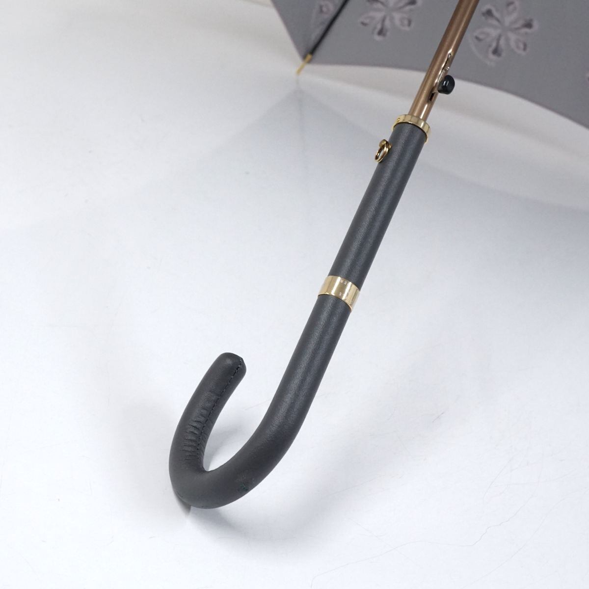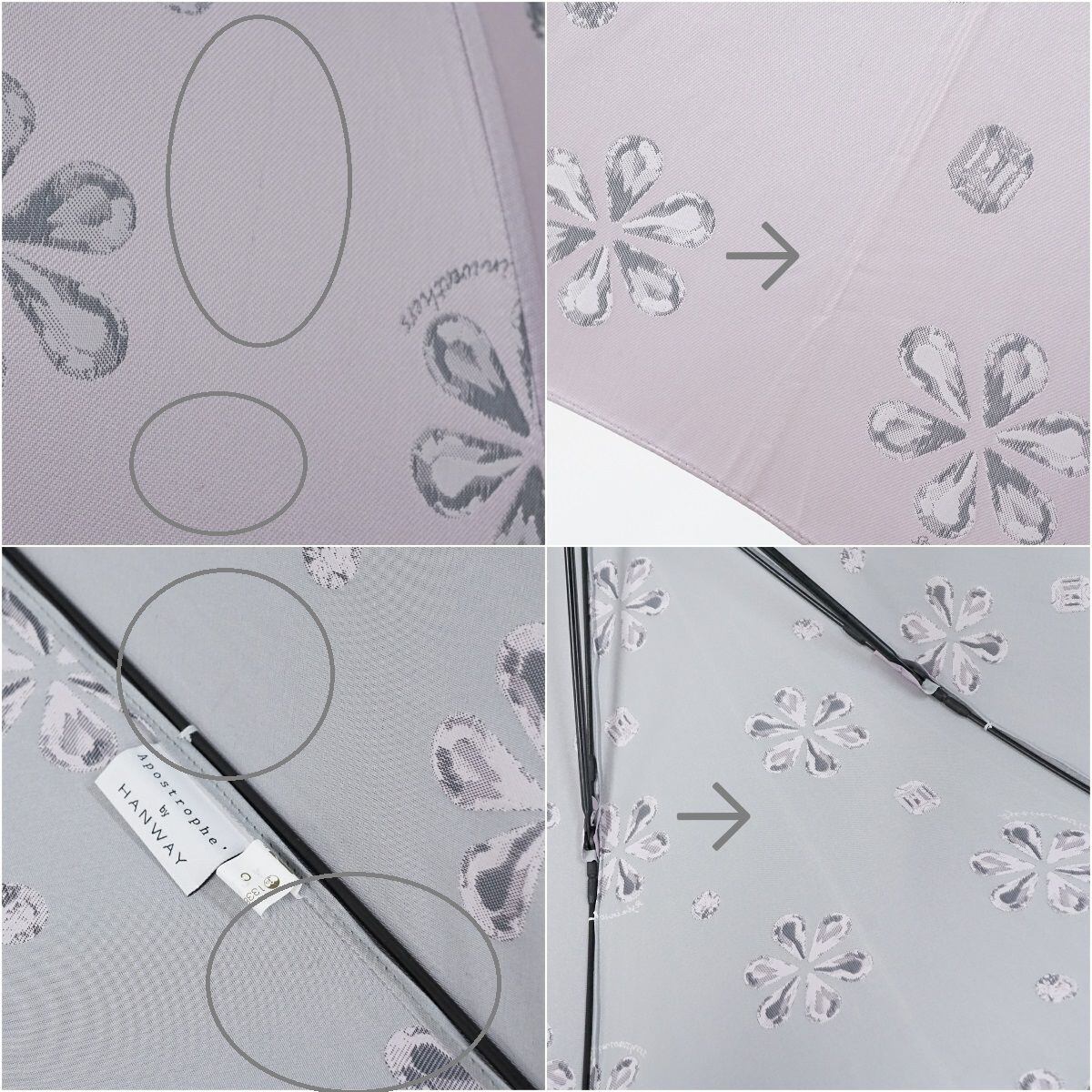 高級傘 HANWAY ハンウェイ USED美品 ピンクグレー 花柄 ジャガード エレガント レザー手元 グラス骨 ジャンプ 60cm S1558