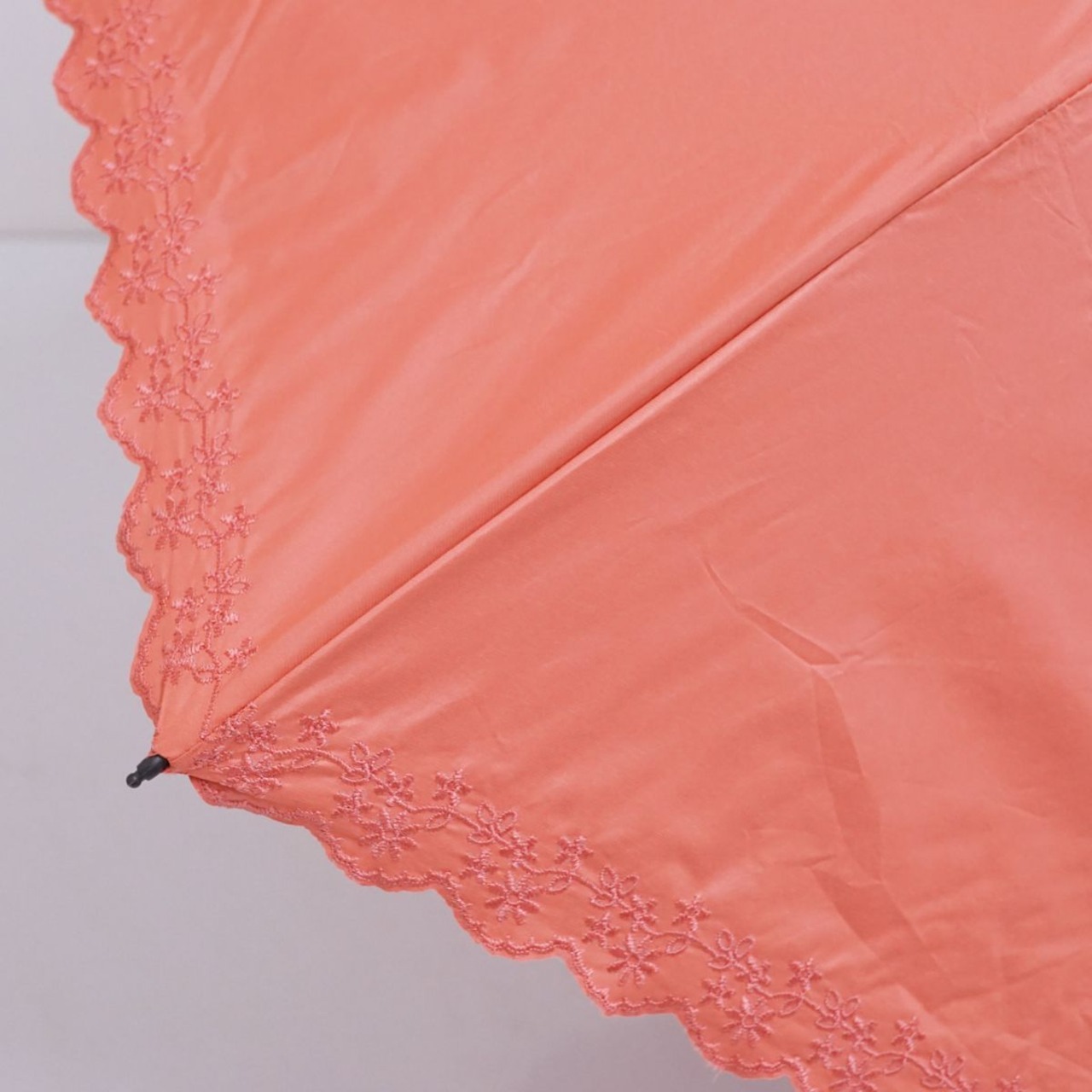 コーラルピンクの生地の外周を刺繍で縁取りしたシンプルながらキュートなデザインです。