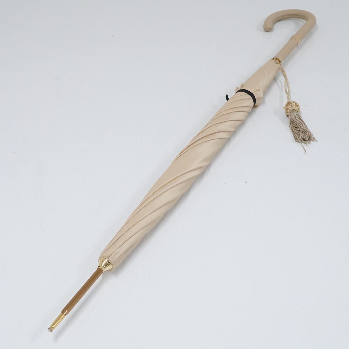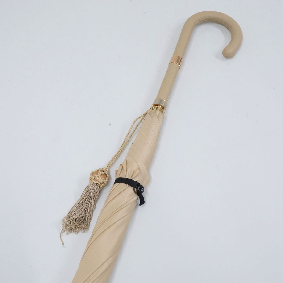 高級傘 HANWAY ハンウェイ USED美品 レディース ライトベージュ 無地 細巻 シンプル タッセル付き ブランド 長傘 雨傘 55cm S1581
