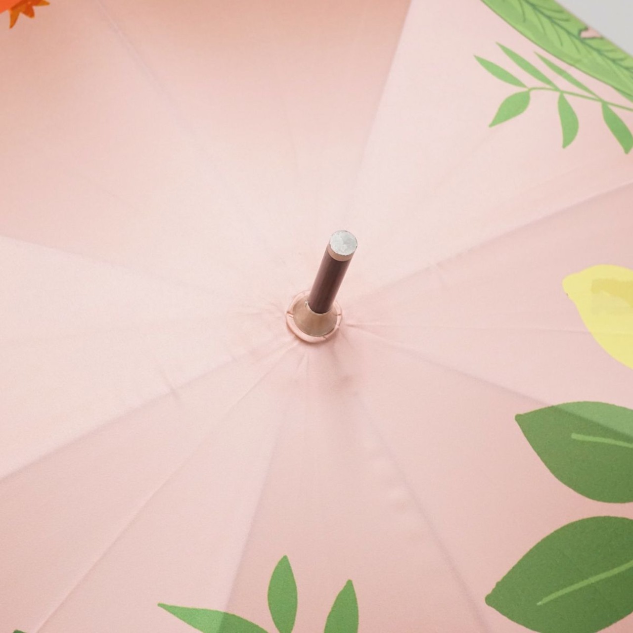 ピンクの生地に南国の植物やクロヒョウ、オニオオハシなどの動物が描かれている個性的でおしゃれなデザインです。
