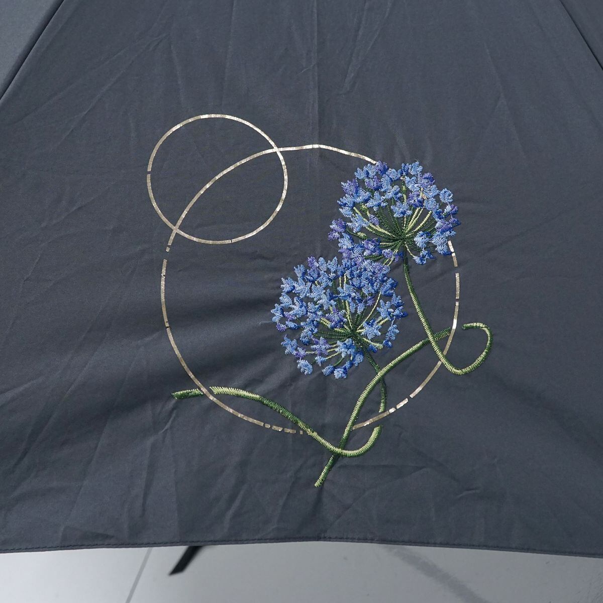 上品なグレーの生地にゴールドの箔プリントと刺繍をあしらったエレガントな折りたたみパラソルです。
