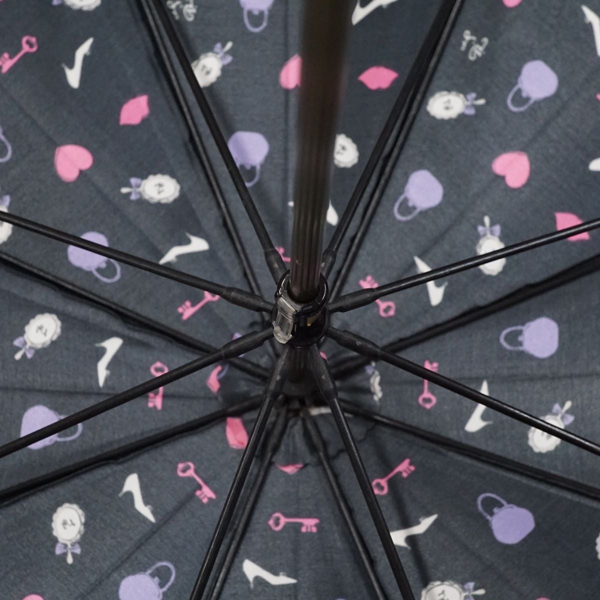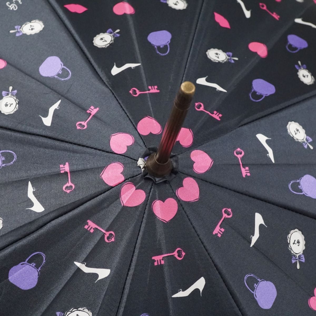 手鏡やハート、バッグなどのカラフルなプリントがかわいいデザインです。