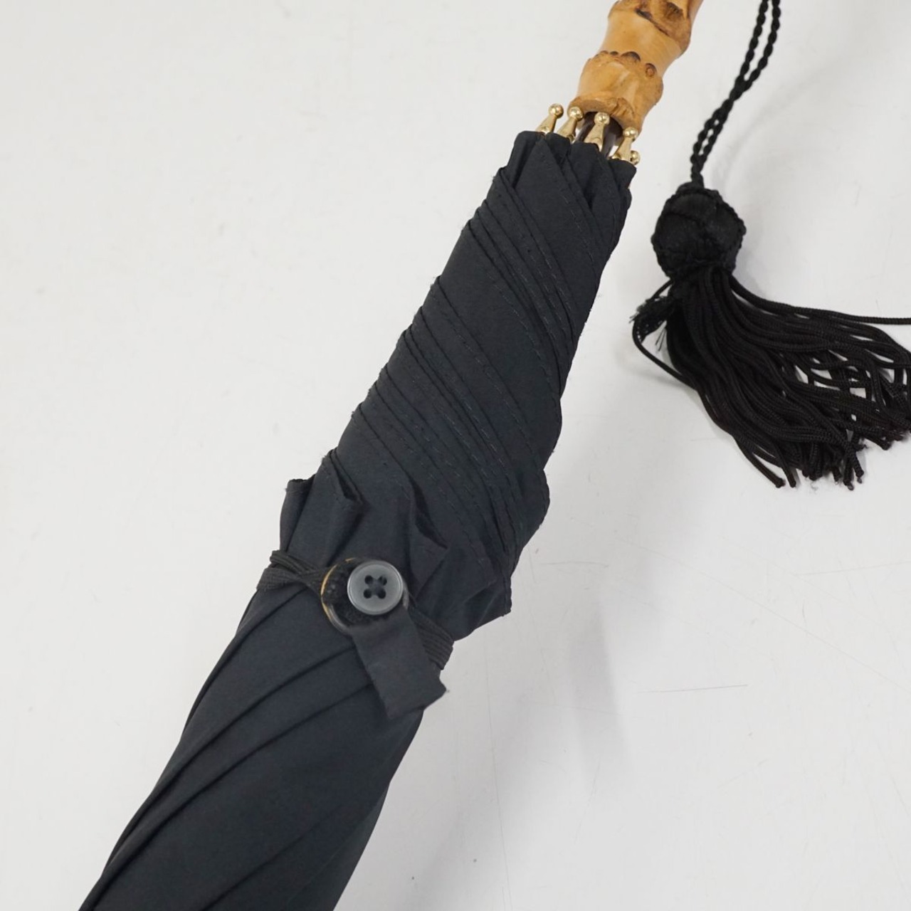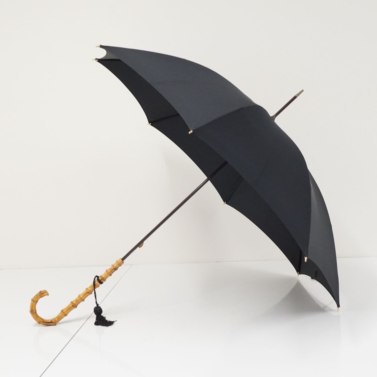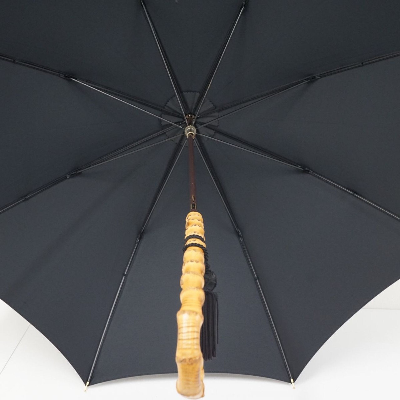 こちらはブラックのシンプルな生地に長めの寒竹手元を合わせたナチュラルな印象の逸品です。