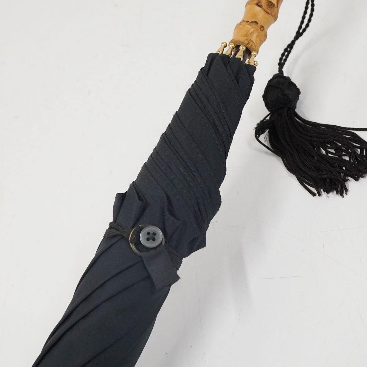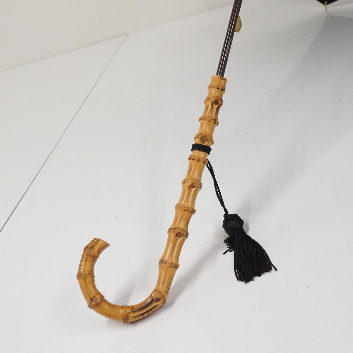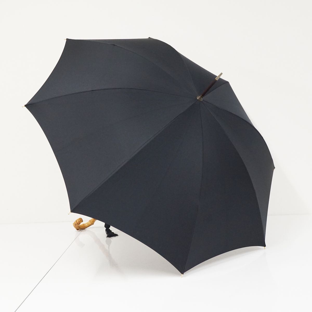 こちらはブラックのシンプルな生地に長めの寒竹手元を合わせたナチュラルな印象の逸品です。