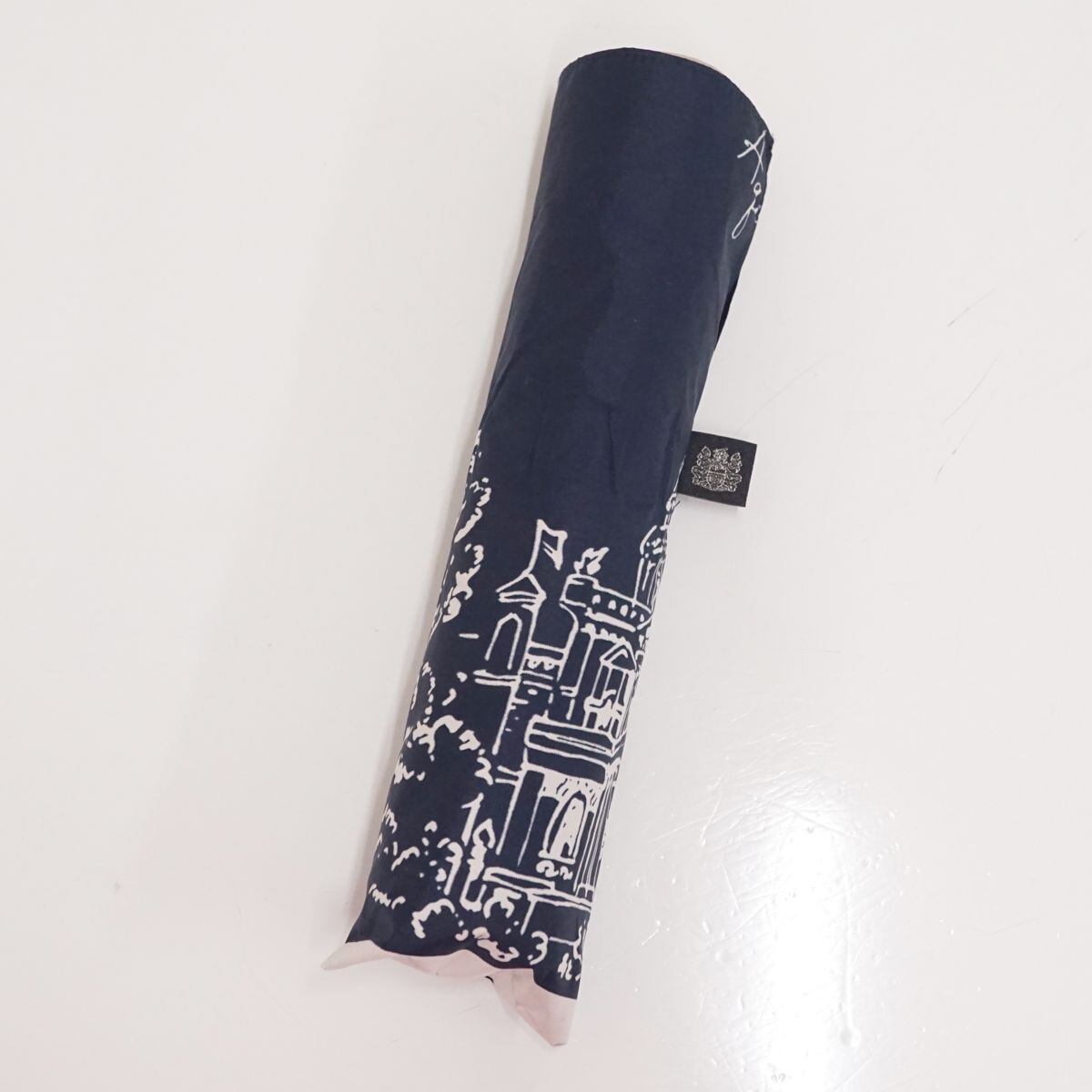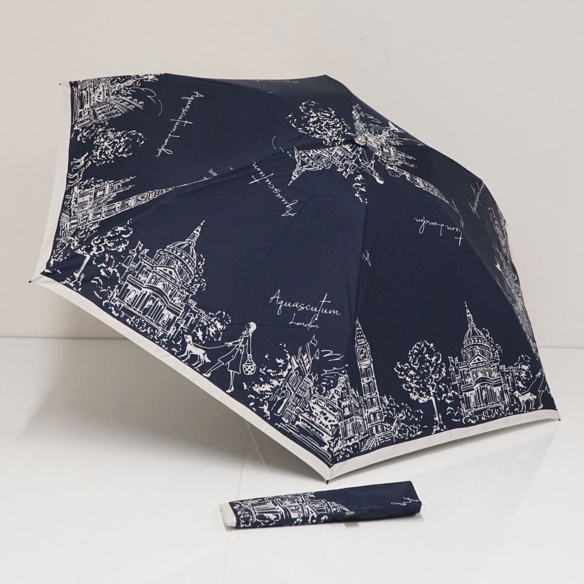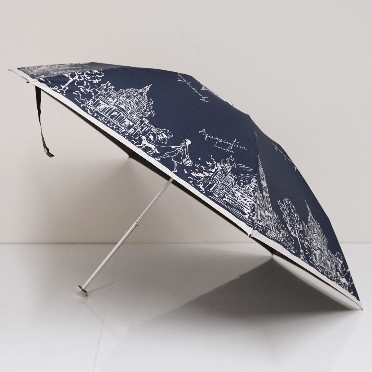 折りたたみ日傘 Aquascutum USED超美品 サマーシールドLll アクアスキュータム 街並み 遮光 遮熱 UV 高機能日傘 ネイビー 50cm FS8740