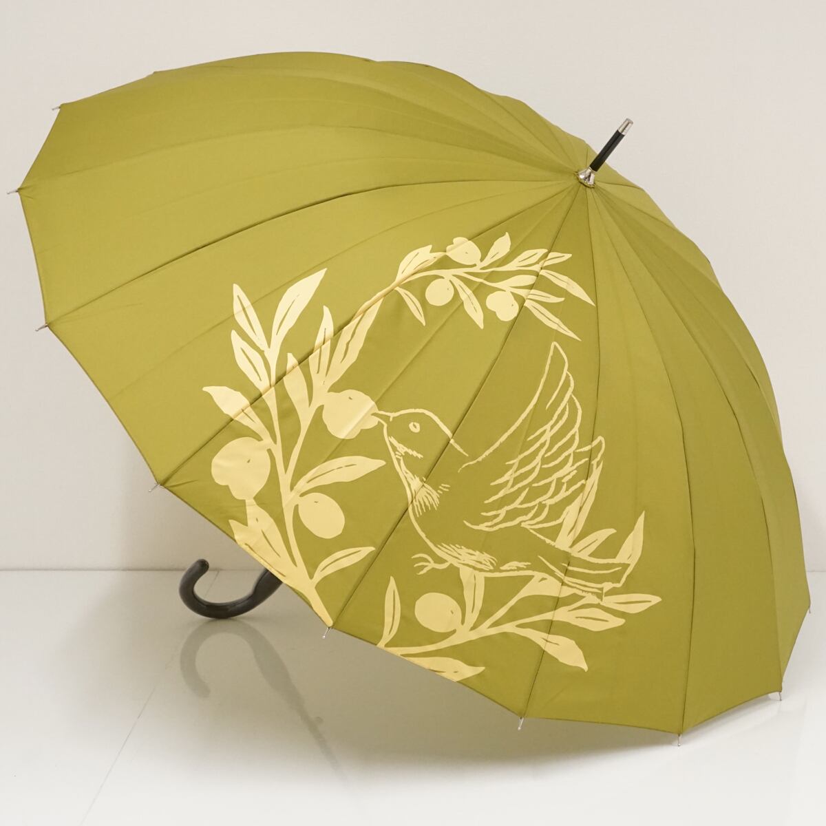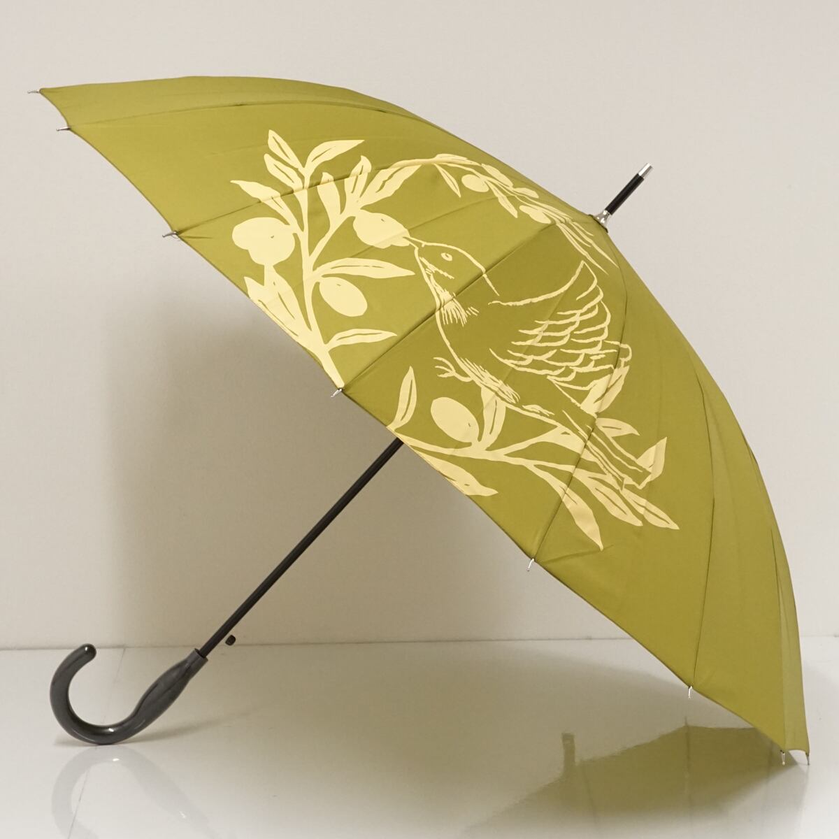 鶯色生地に、木の実を啄む鳥を描いたアーティスティックなデザインのアンブレラです。