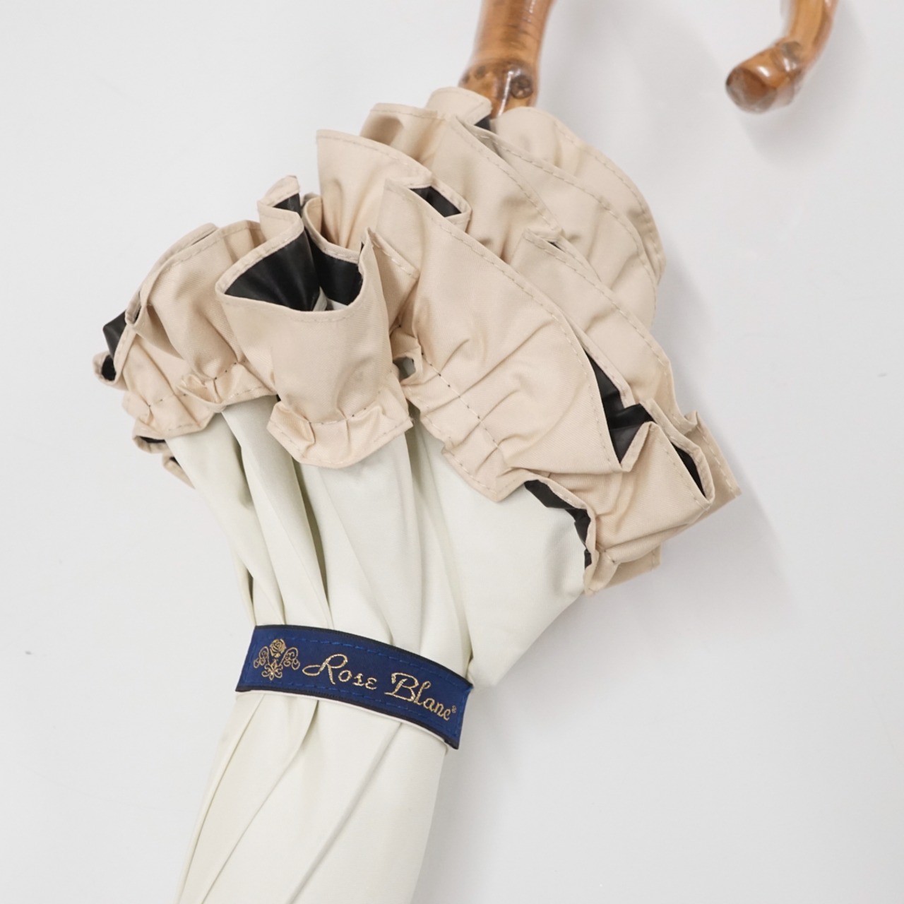 シンプルなカラーと、上品なフリル、最高級の竹を使用した手元が高級感あるデサインです。