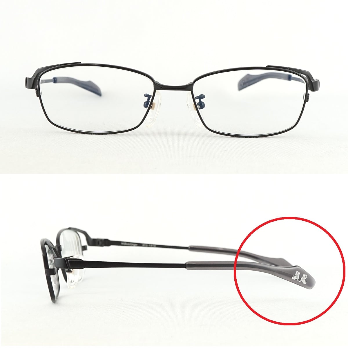 ※フレームにやや歪みがあり、眼鏡を開いて置いた際に左側が少々浮いてしまいます。(画像3枚目、赤印部分をご確認ください。)