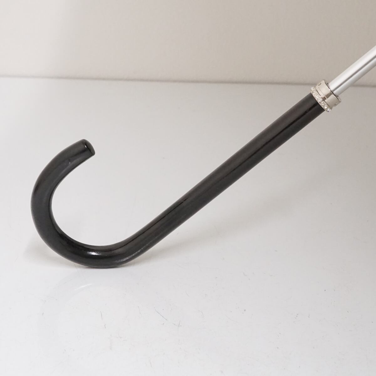 淡い光沢のあるブラックの生地をベースにロゴが散りばめられたエレガントなデザインの傘です。