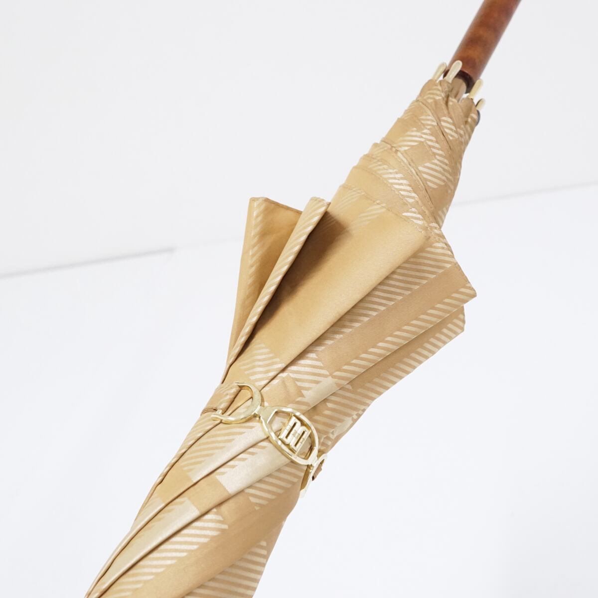 傘 DAKS ダックス ベージュ ロゴ エレガント USED美品 チェック 天然木手元 グラス骨 60cm ジャンプ A1554