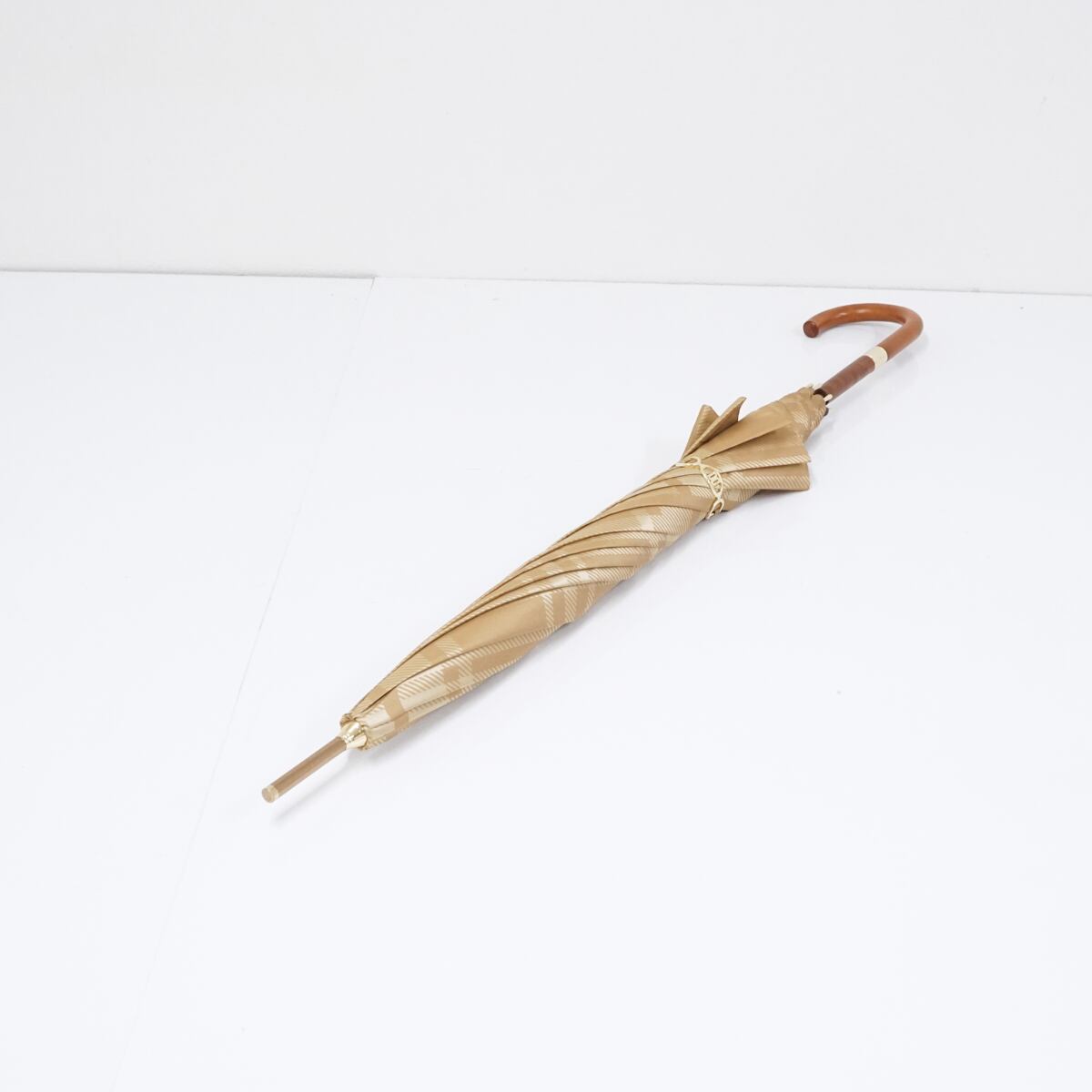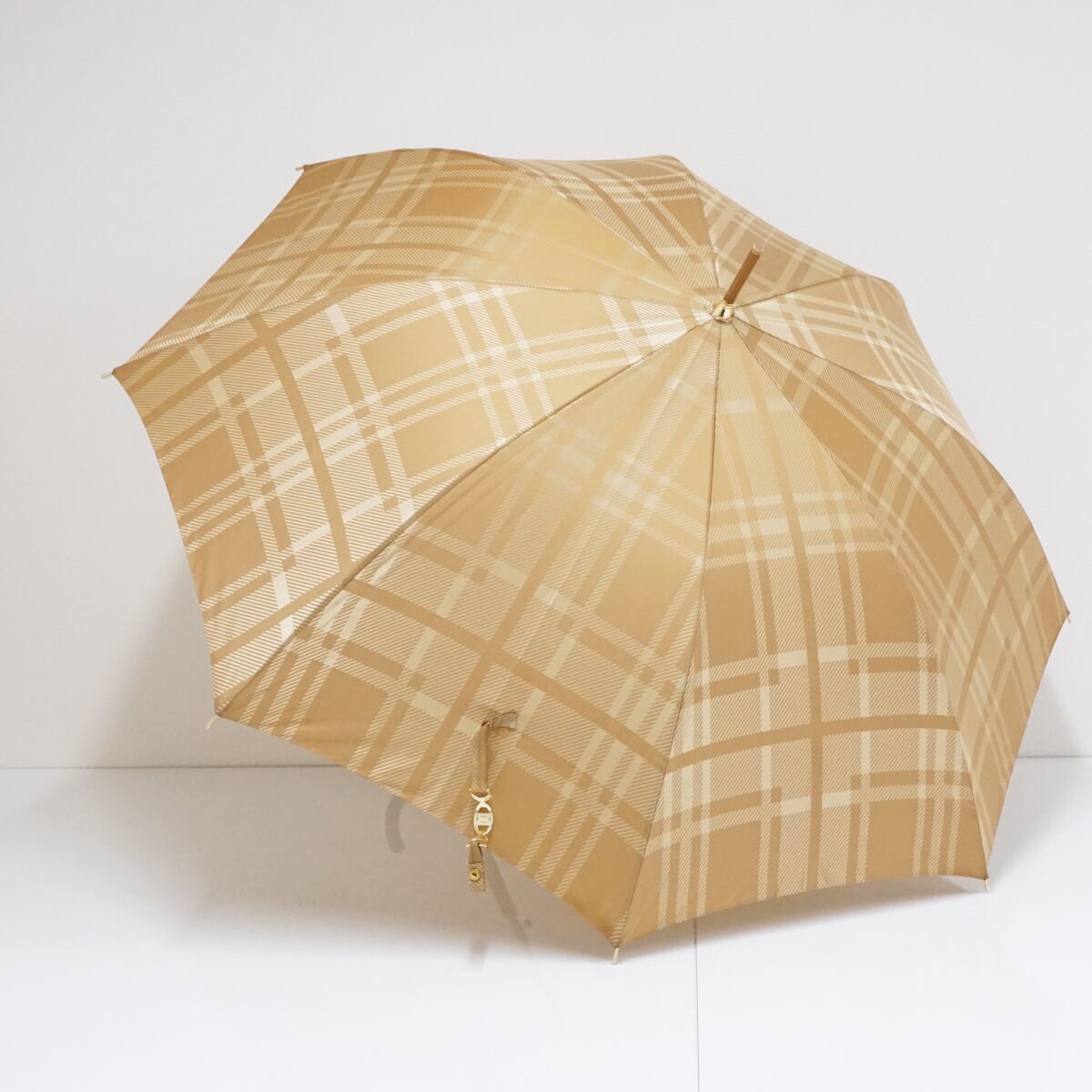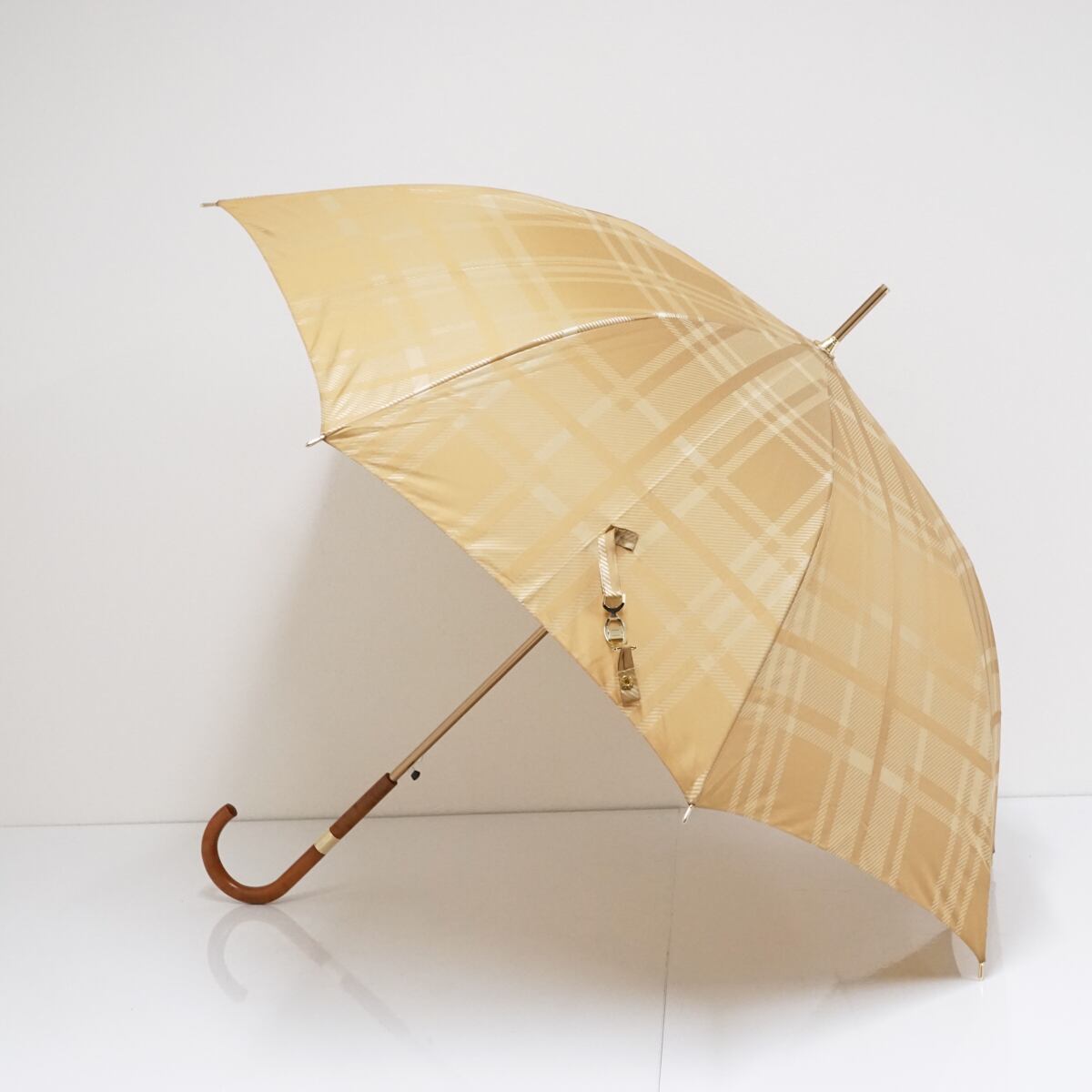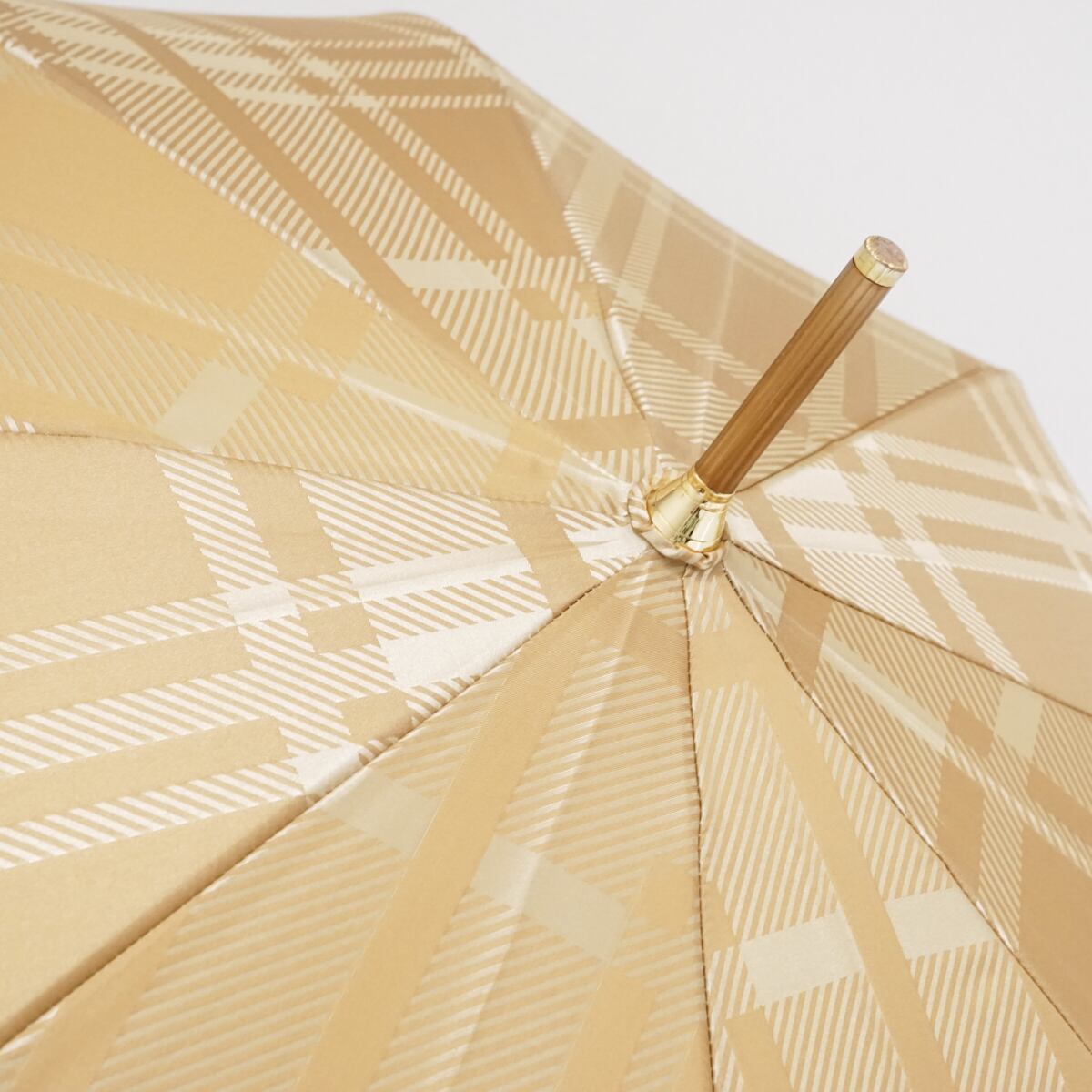 光沢のあるベージュ系の生地をベースに、同系色のチェックパターンをプリントしたデザインの傘です。