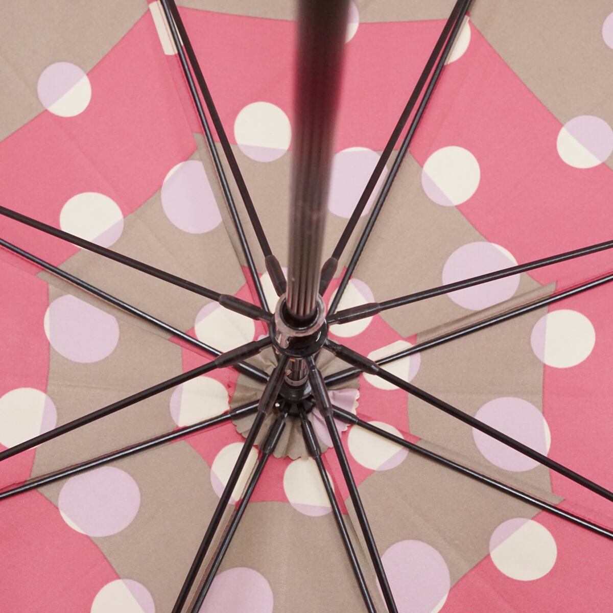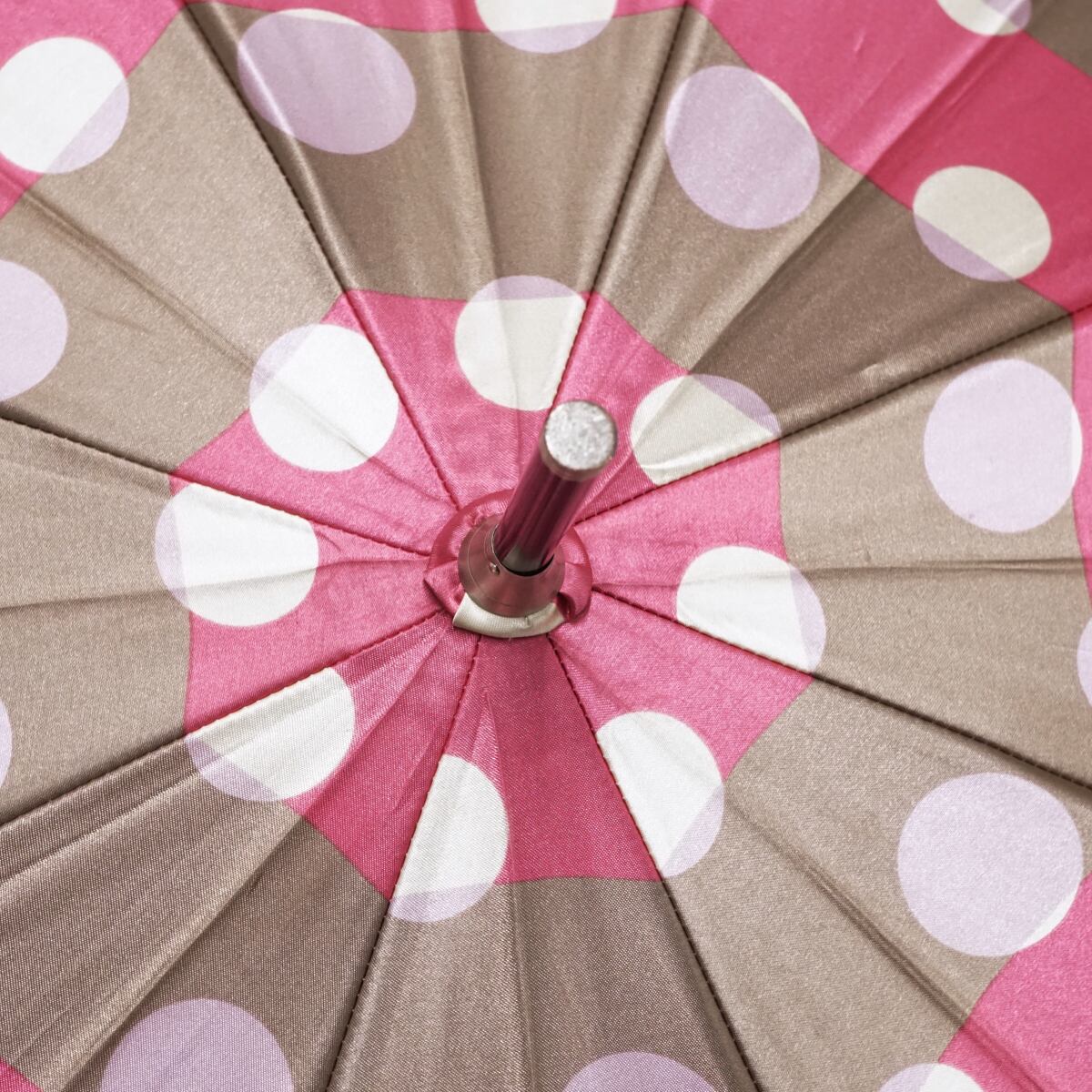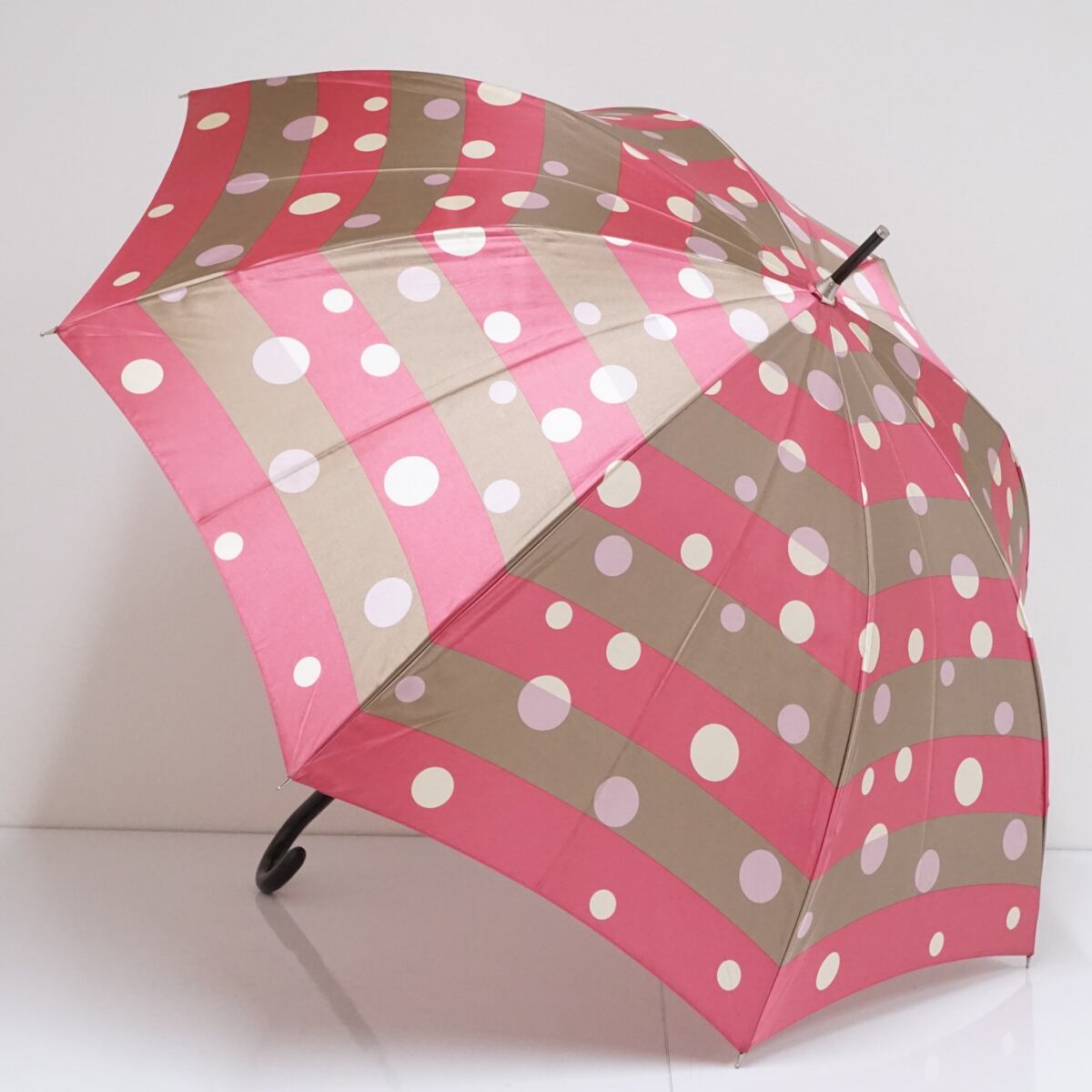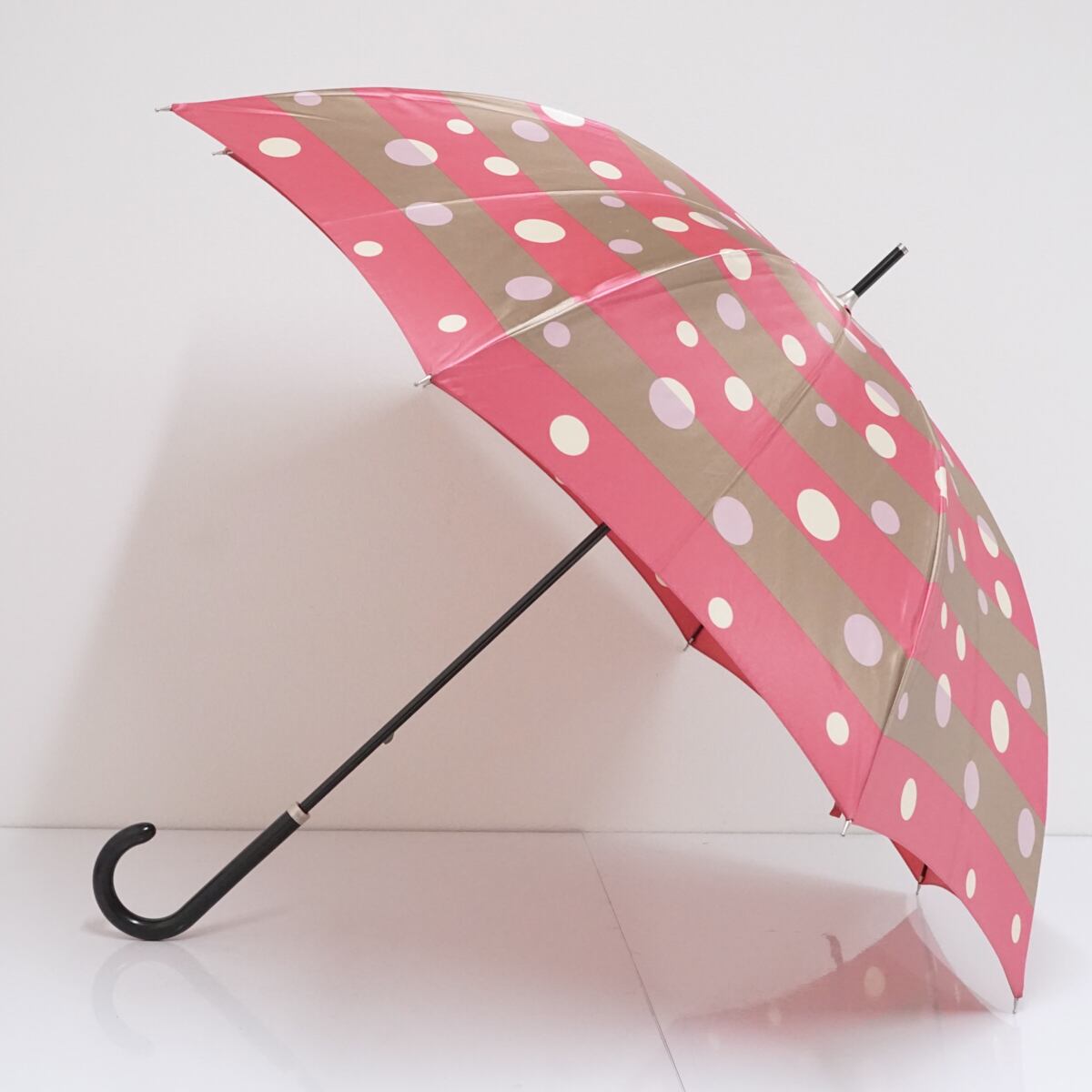 光沢のあるピンクとベージュのボーダー生地にドットをデザインした個性的でかわいい傘です。