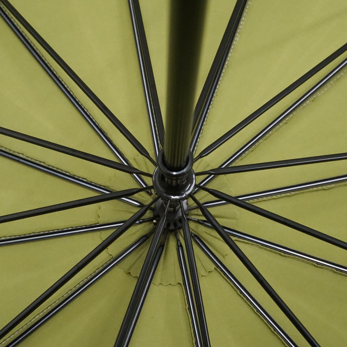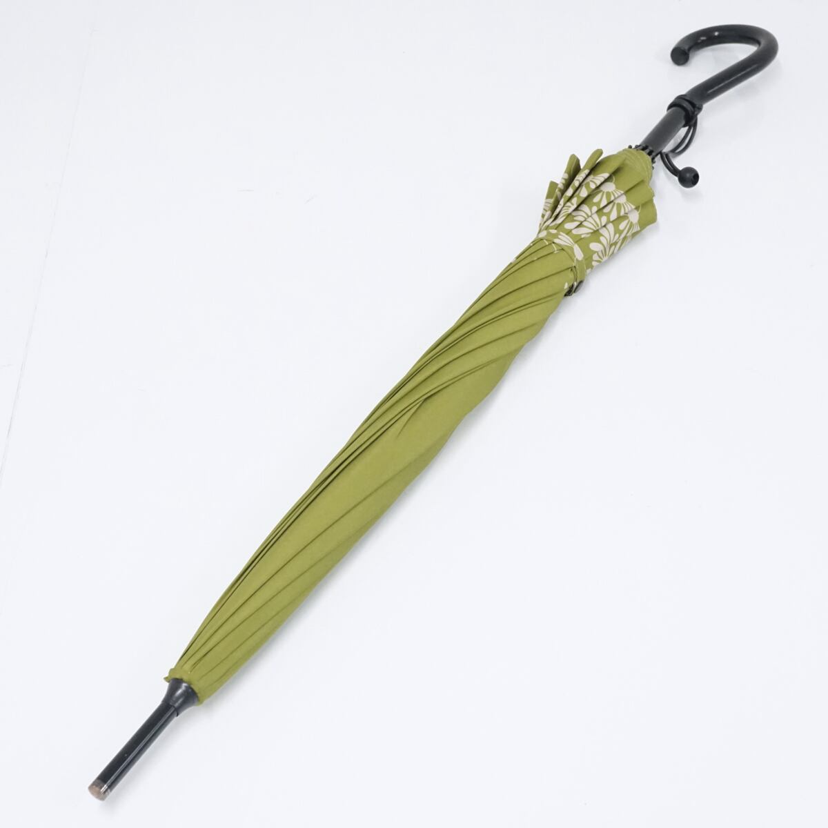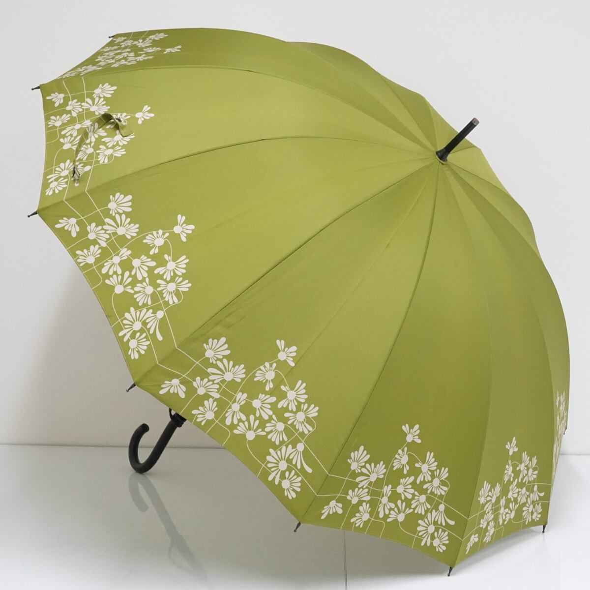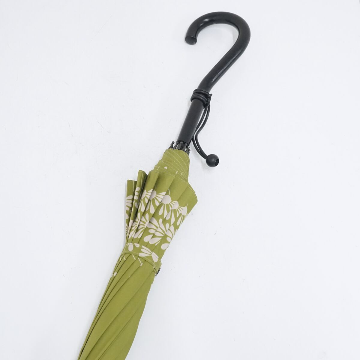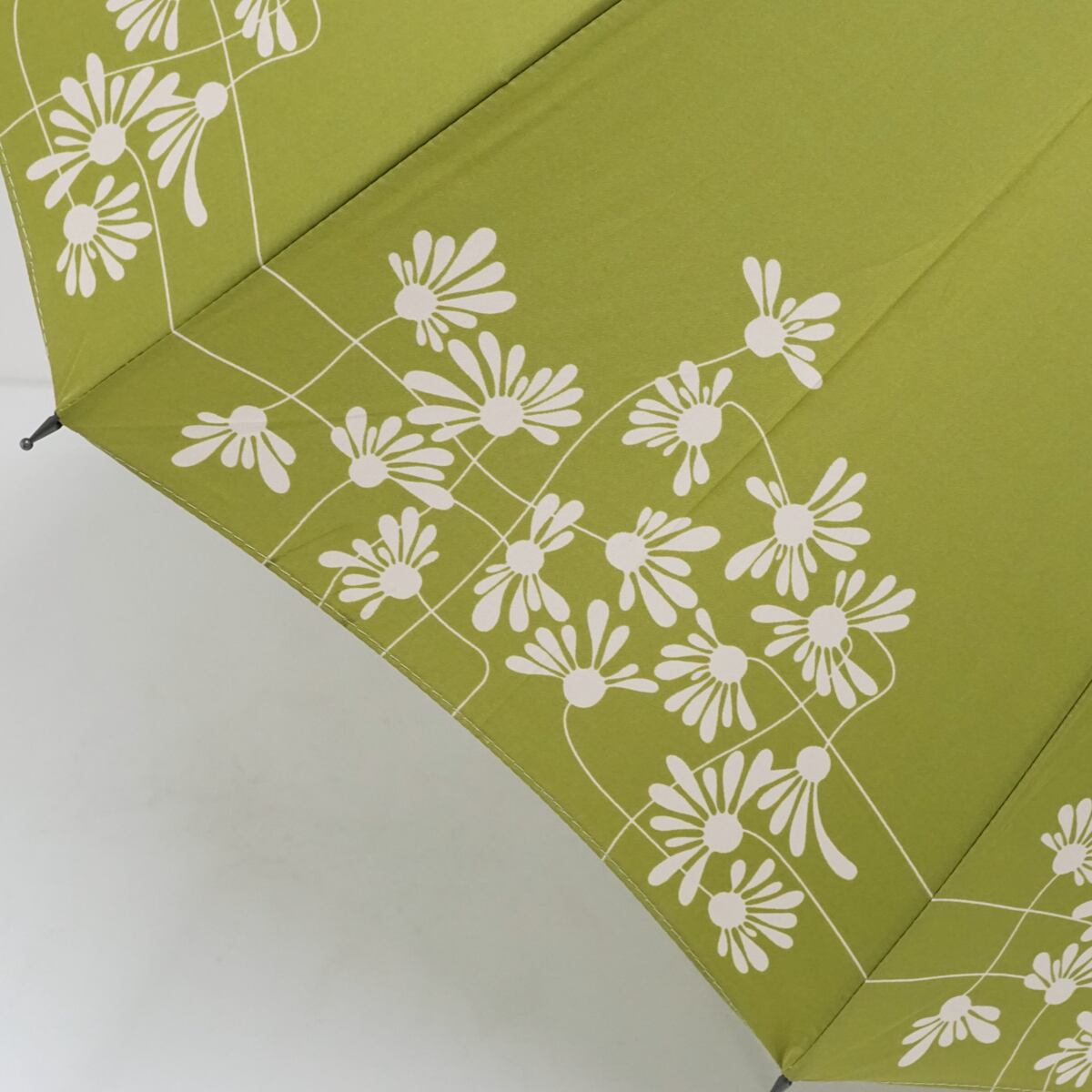グリーンの生地をベースに、外周にキッチュなフラワーを描いた、雨の日に彩りを添えるデザインです。