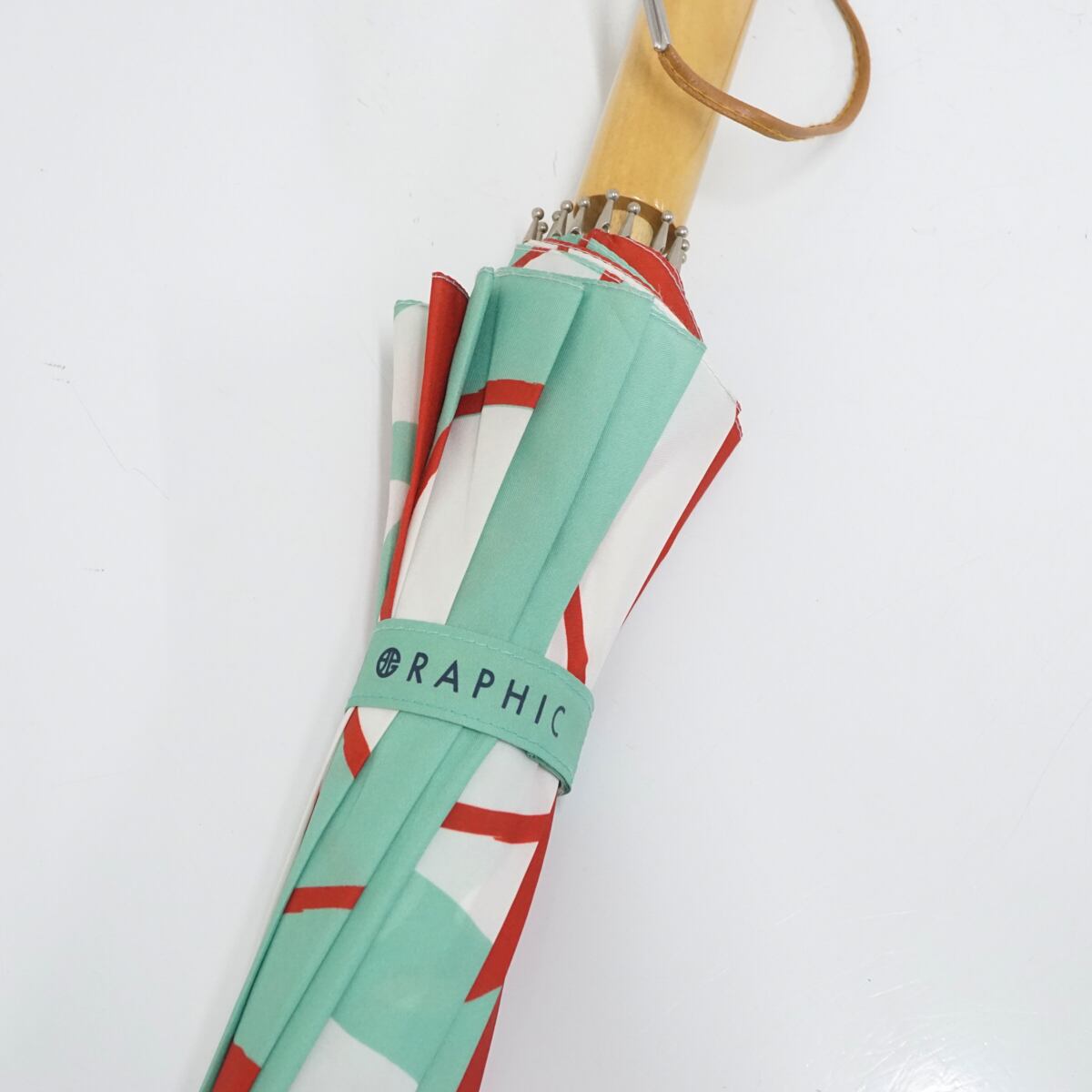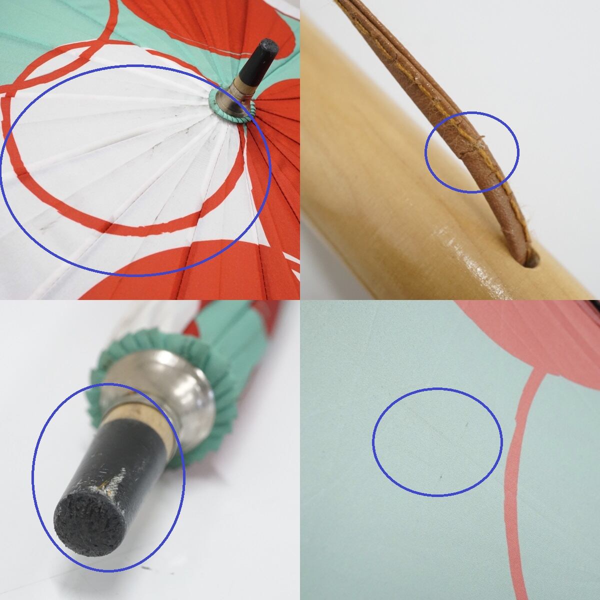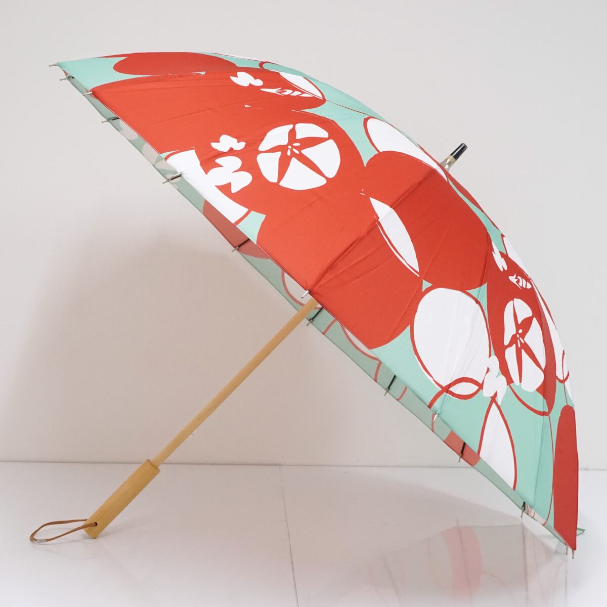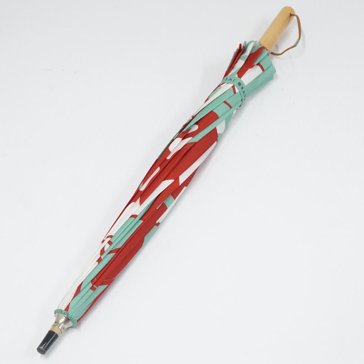 16本骨傘 北斎グラフィック USED美品 朝顔 赤 ライトグリーン 和柄テキスタイル グラス骨 多間 UV 60cm A1826