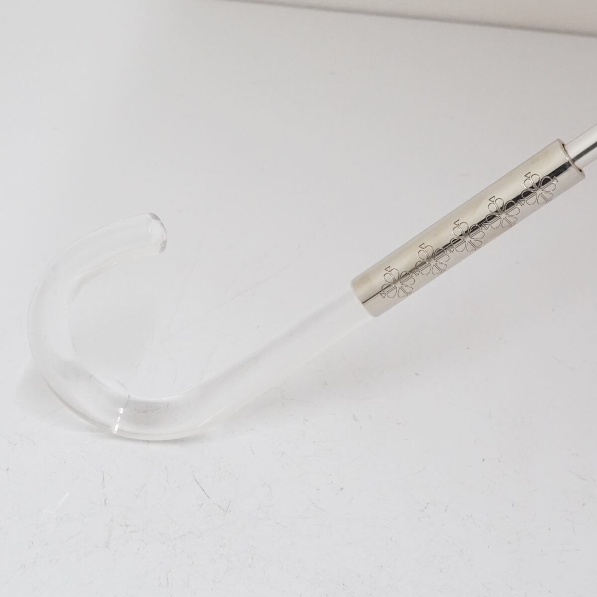 クリア×シルバーの手元、一間に入ったゴールドのロゴプリントがアクセントを聞かせています。