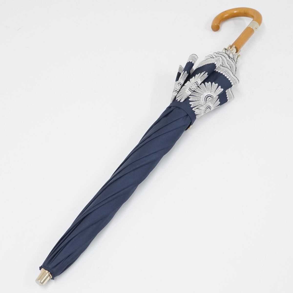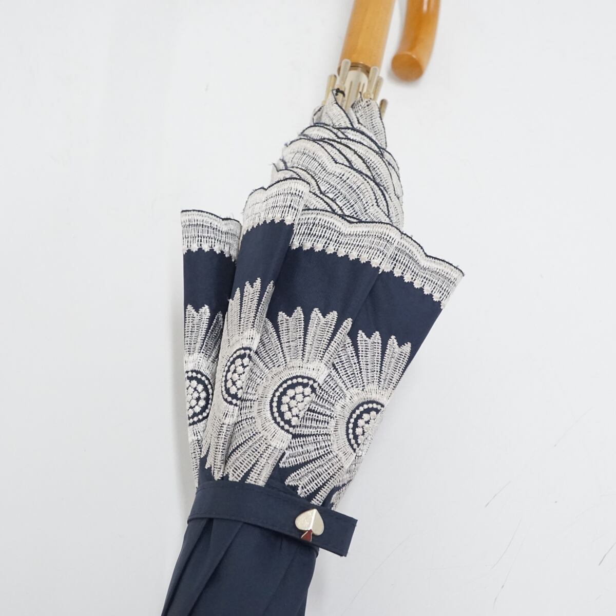 ネイビーの生地にフラワー刺繍のデザインがキュートな雰囲気の晴雨兼用の日傘です。