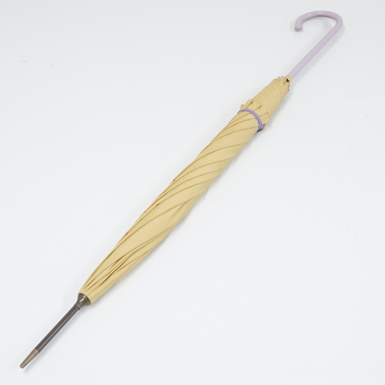 こちらはイエロー系カラーのシンプルな生地にライラックカラーが美しい長めのレザー手元を合わせた逸品です。