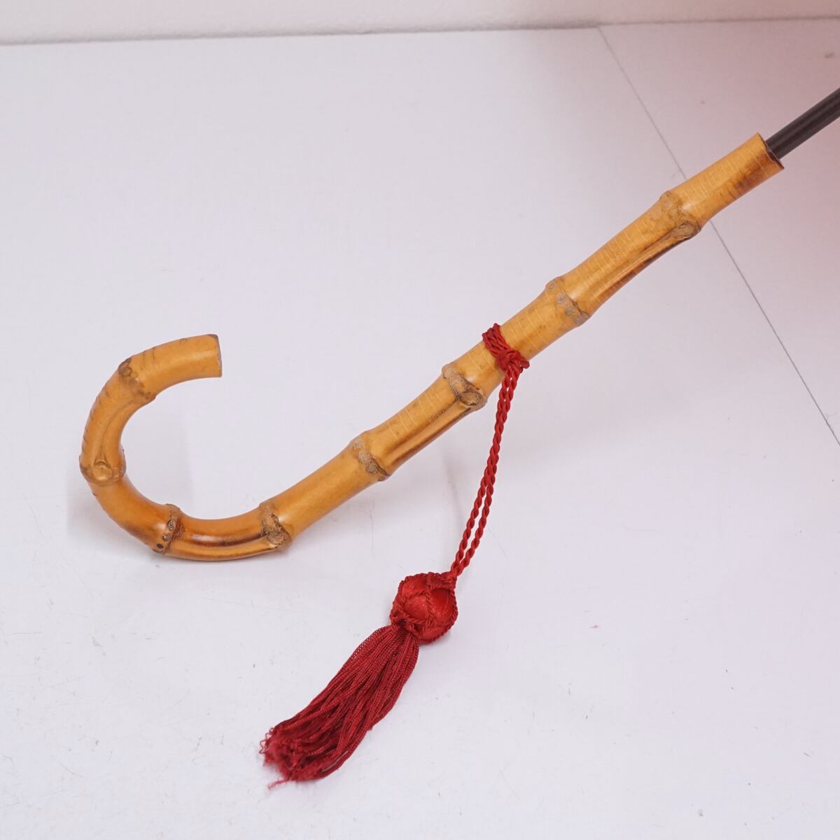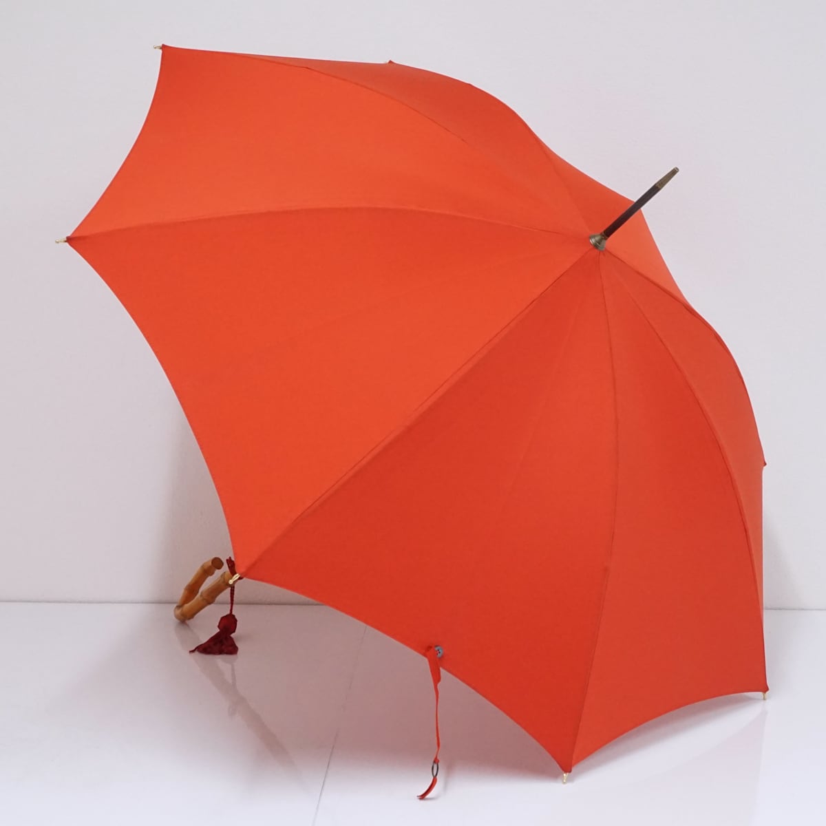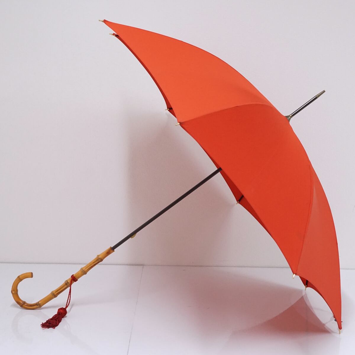 こちらはレッドの生地に長めの寒竹手元を合わせたナチュラルな印象の逸品です。