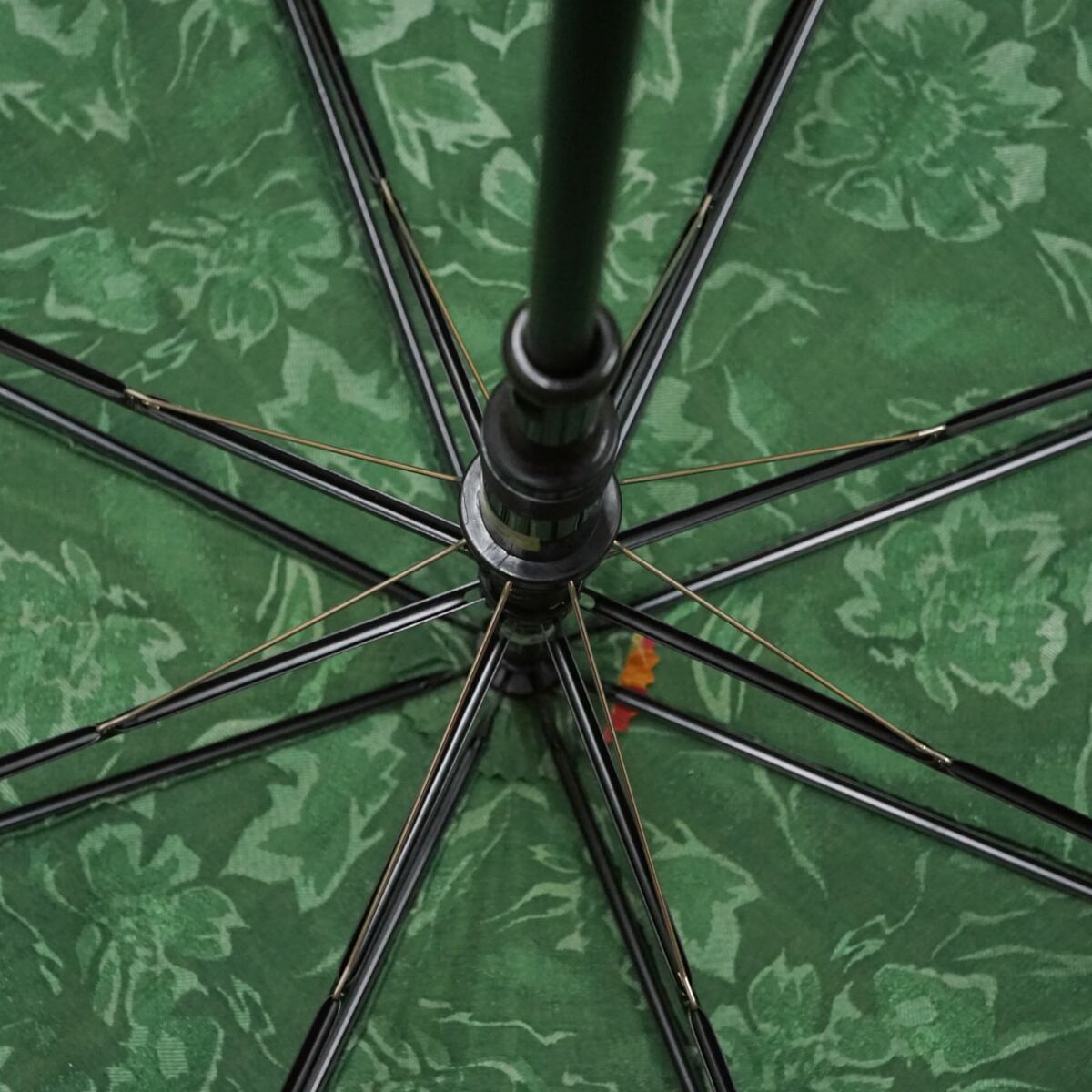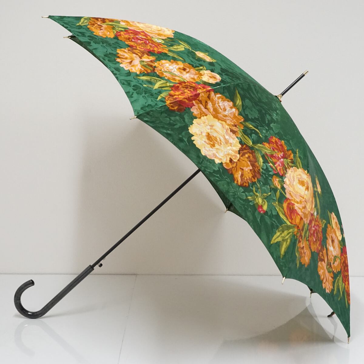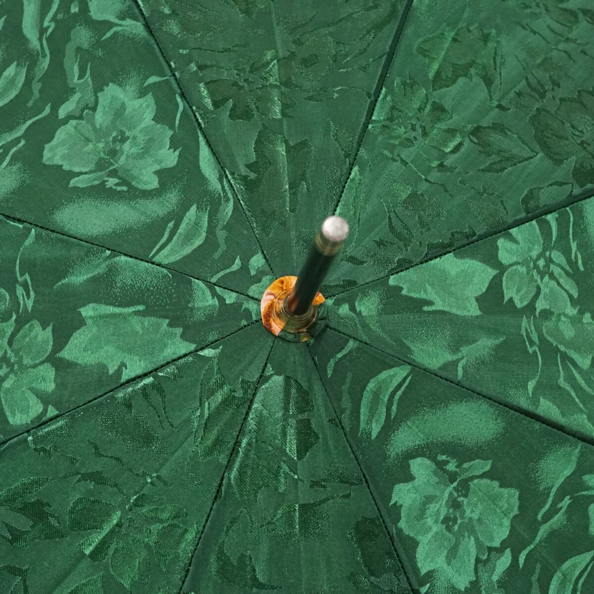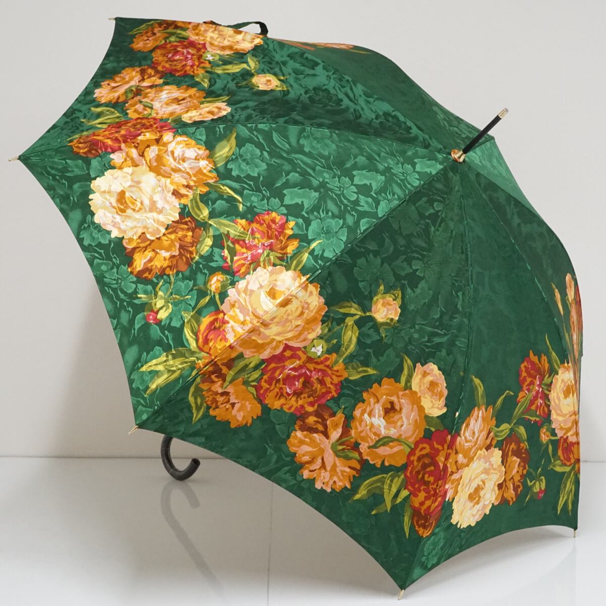 角度によって光沢が見えるグリーンの花柄生地に華やかなフラワーをデザインした華やかで上品な傘です。