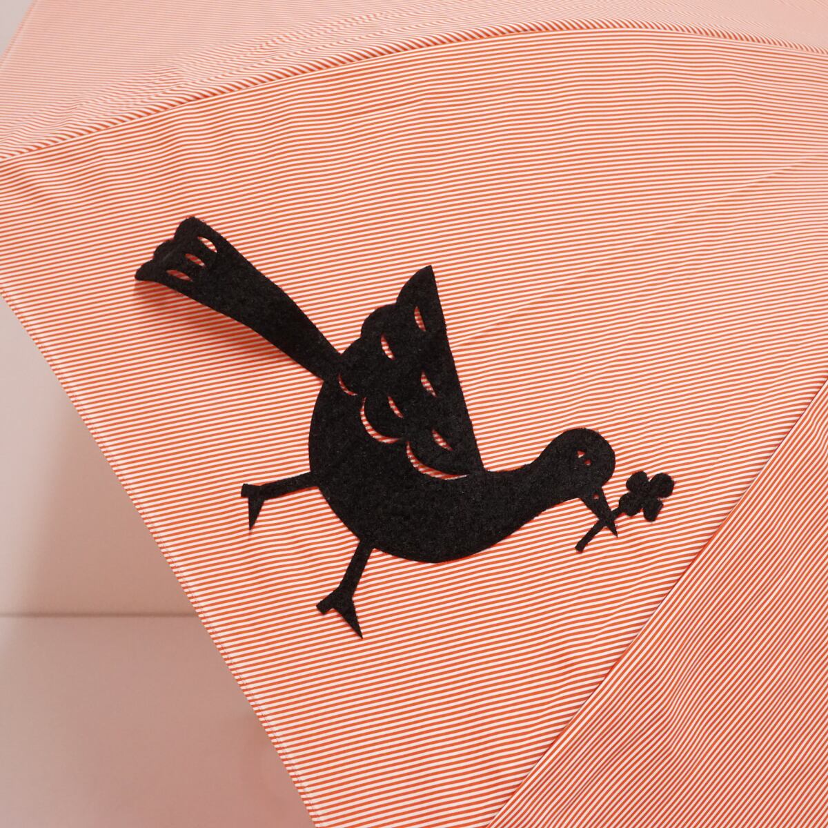 オレンジの細かなストライプ生地に鳥モチーフのデザインが個性的でかわいい一品です。