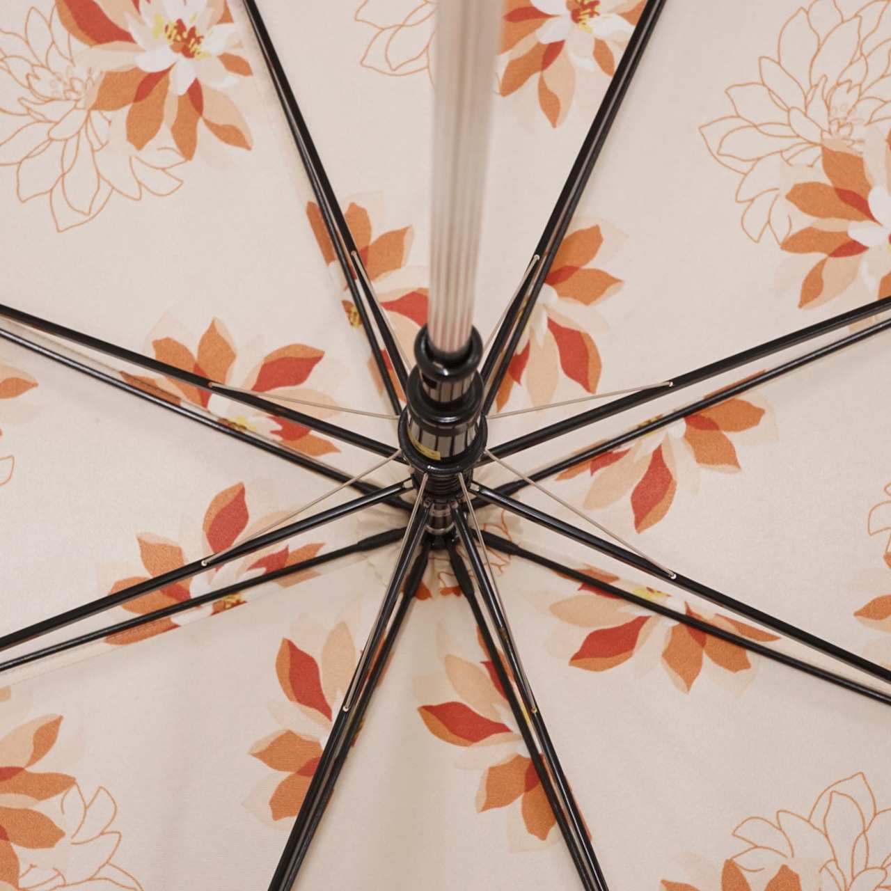 光沢のあるベージュの生地に、オレンジカラーのフラワーをデザインした「ランバンコレクション」の傘です。
