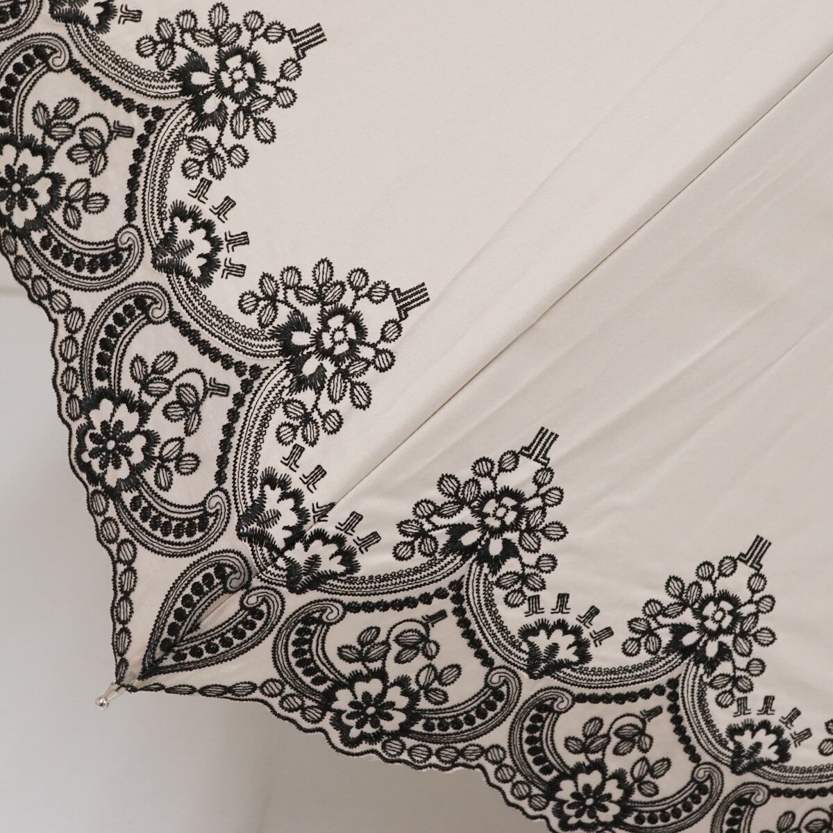 ホワイトベージュの生地の外周にブラックの刺繍をたっぷり施した華やかなデザインです。
