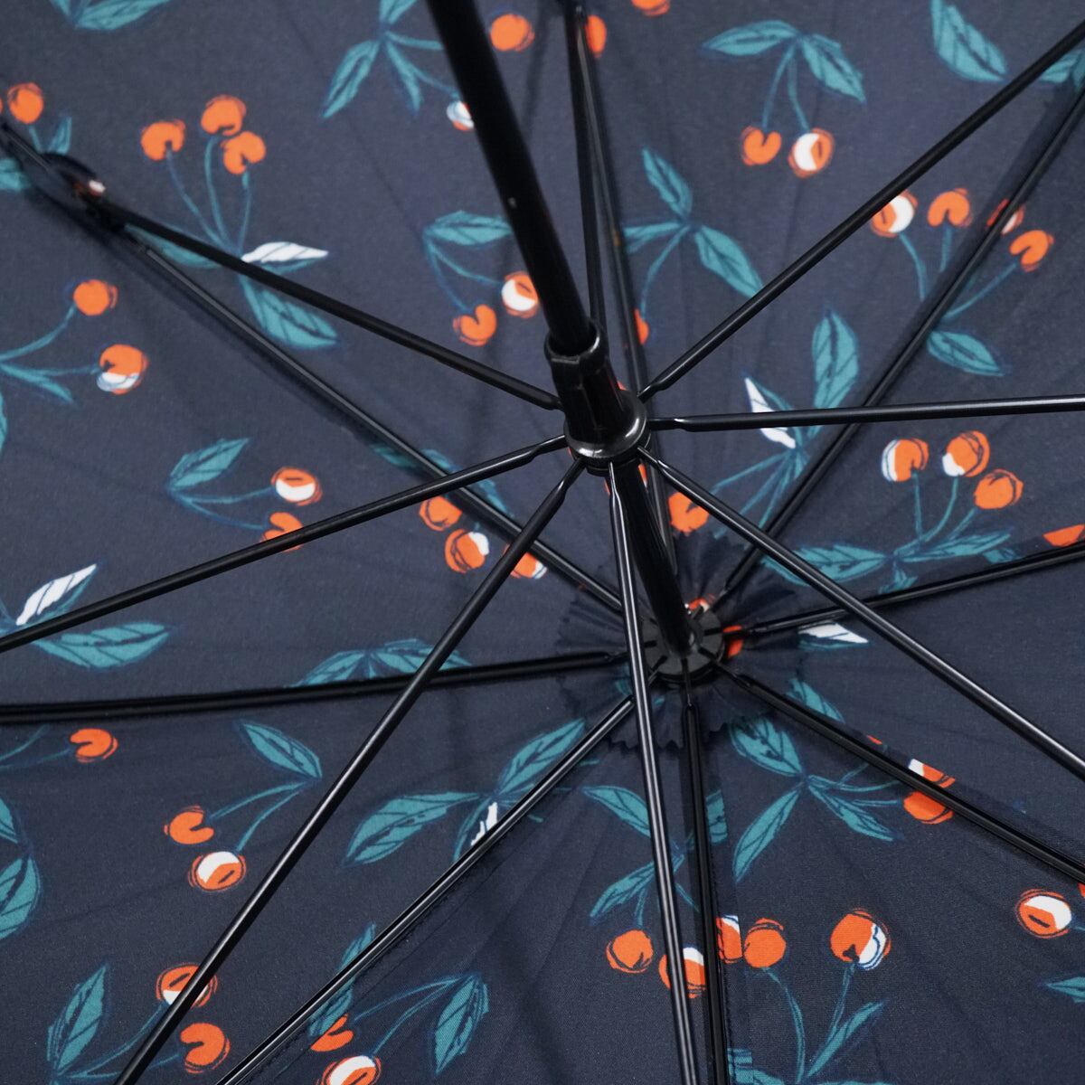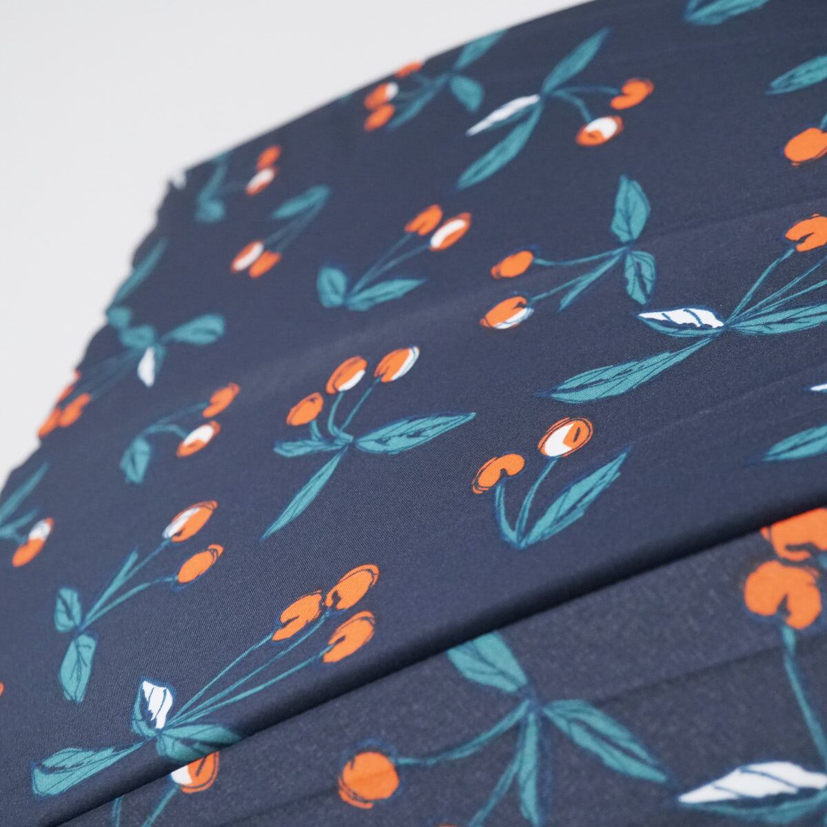 ネイビーの生地にチェリーの総柄が