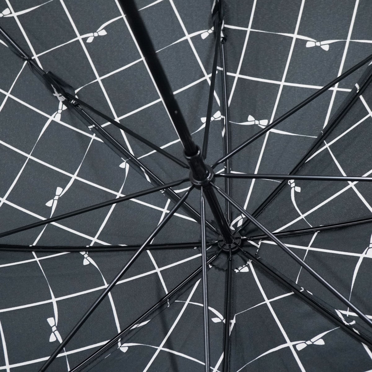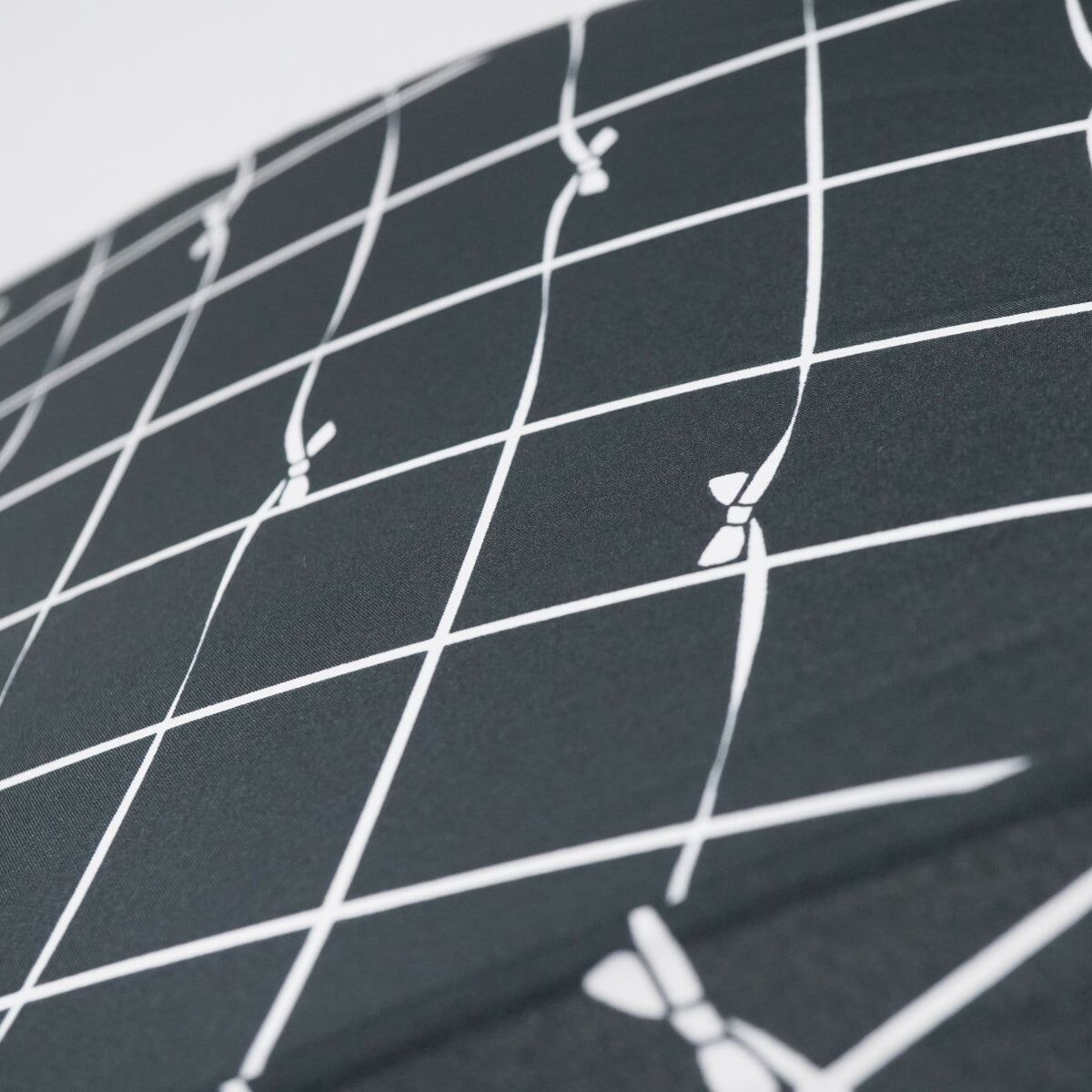 ブラックの生地に格子&リボンをプリントした総柄をスカラップフリルで囲んだ