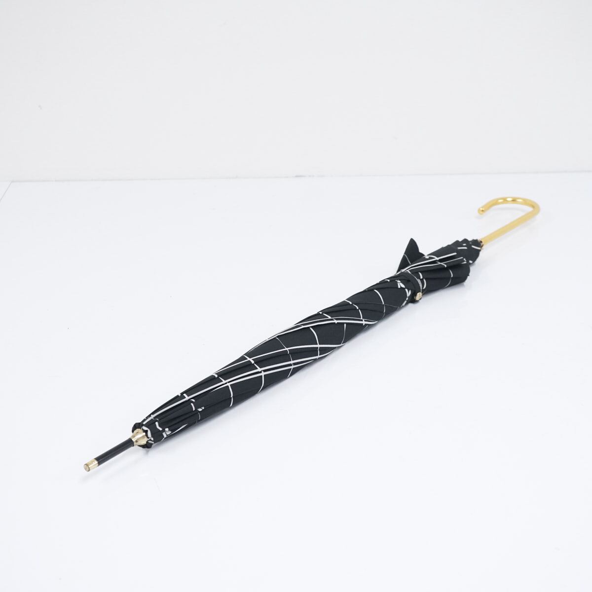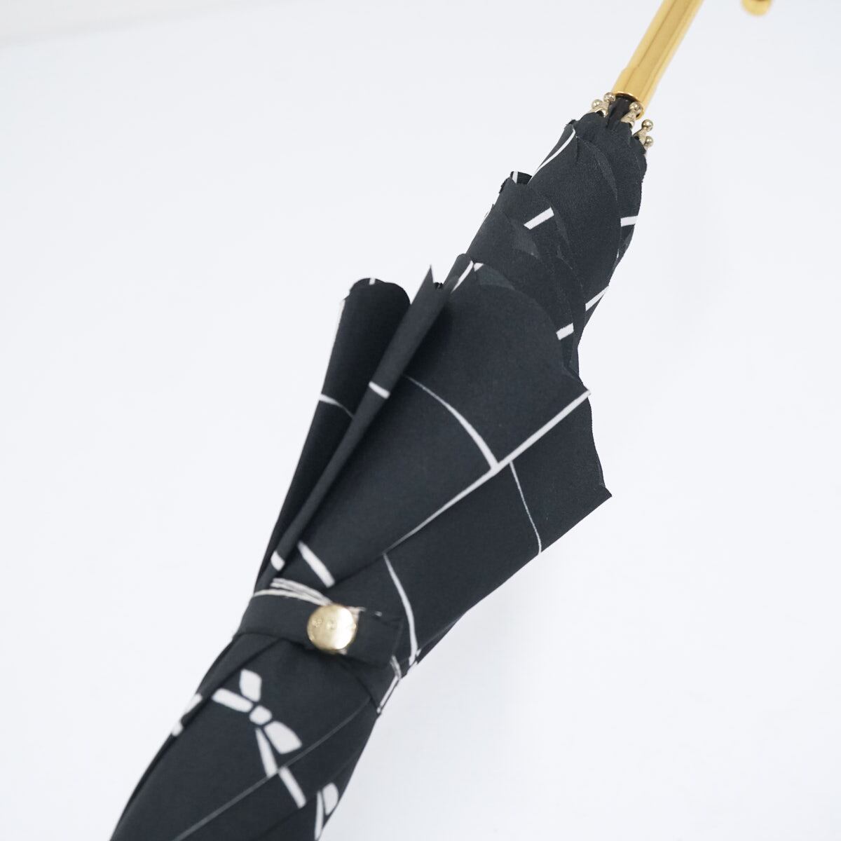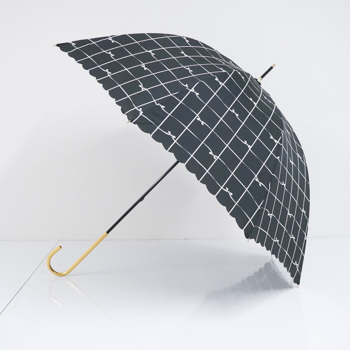 Wpc. ワールドパーティー 傘 USED美品 スカラップフリル ブラック 格子 リボン ゴールド手元 58cm BT1953