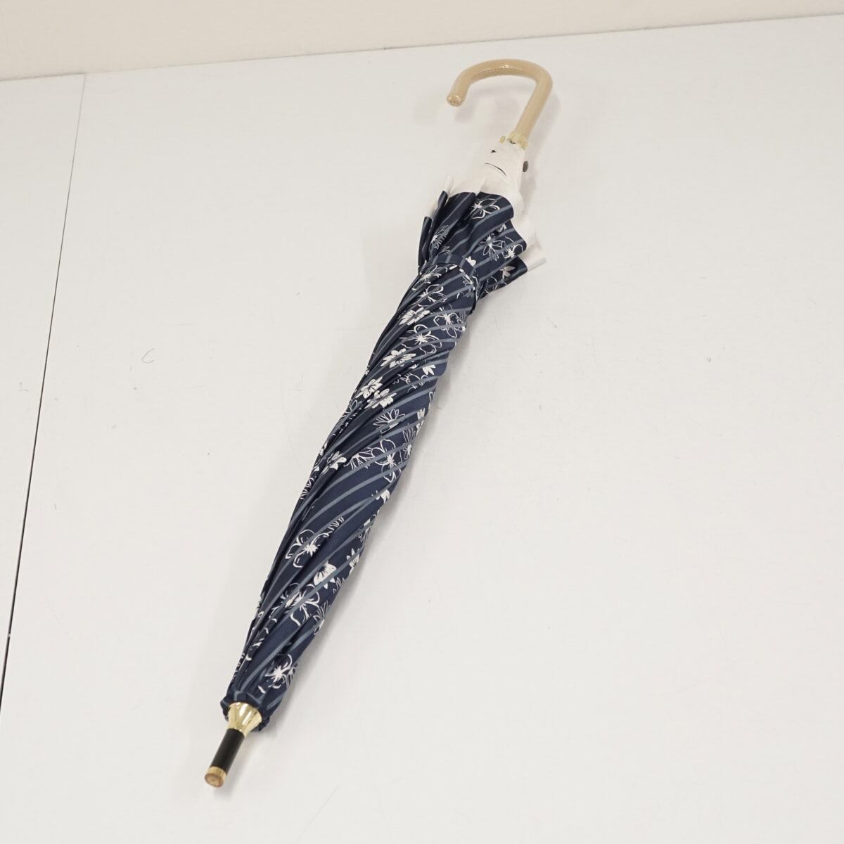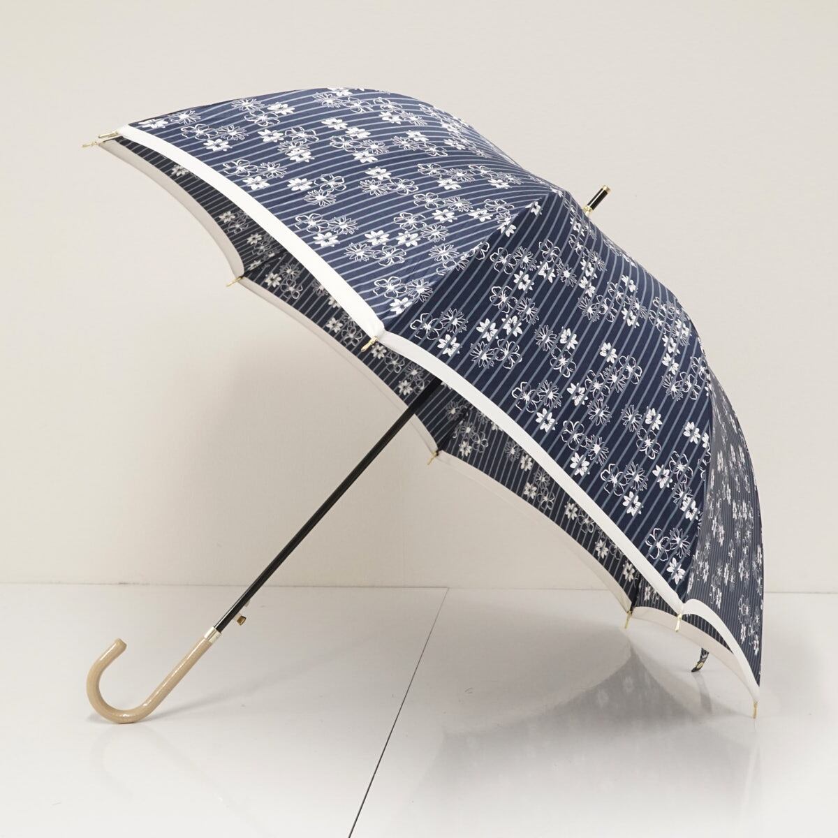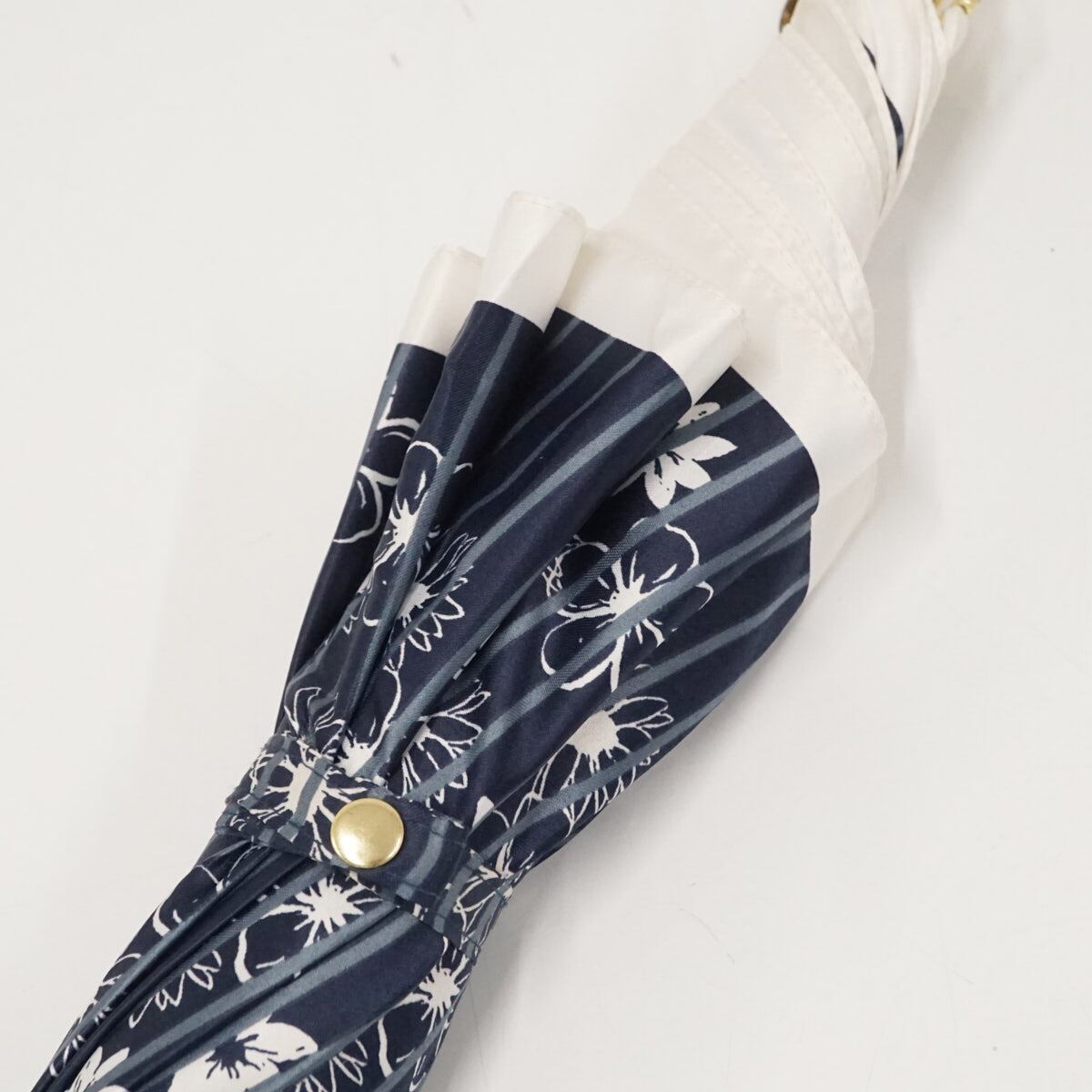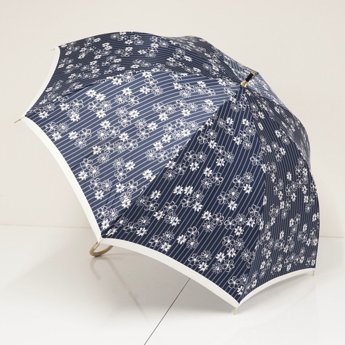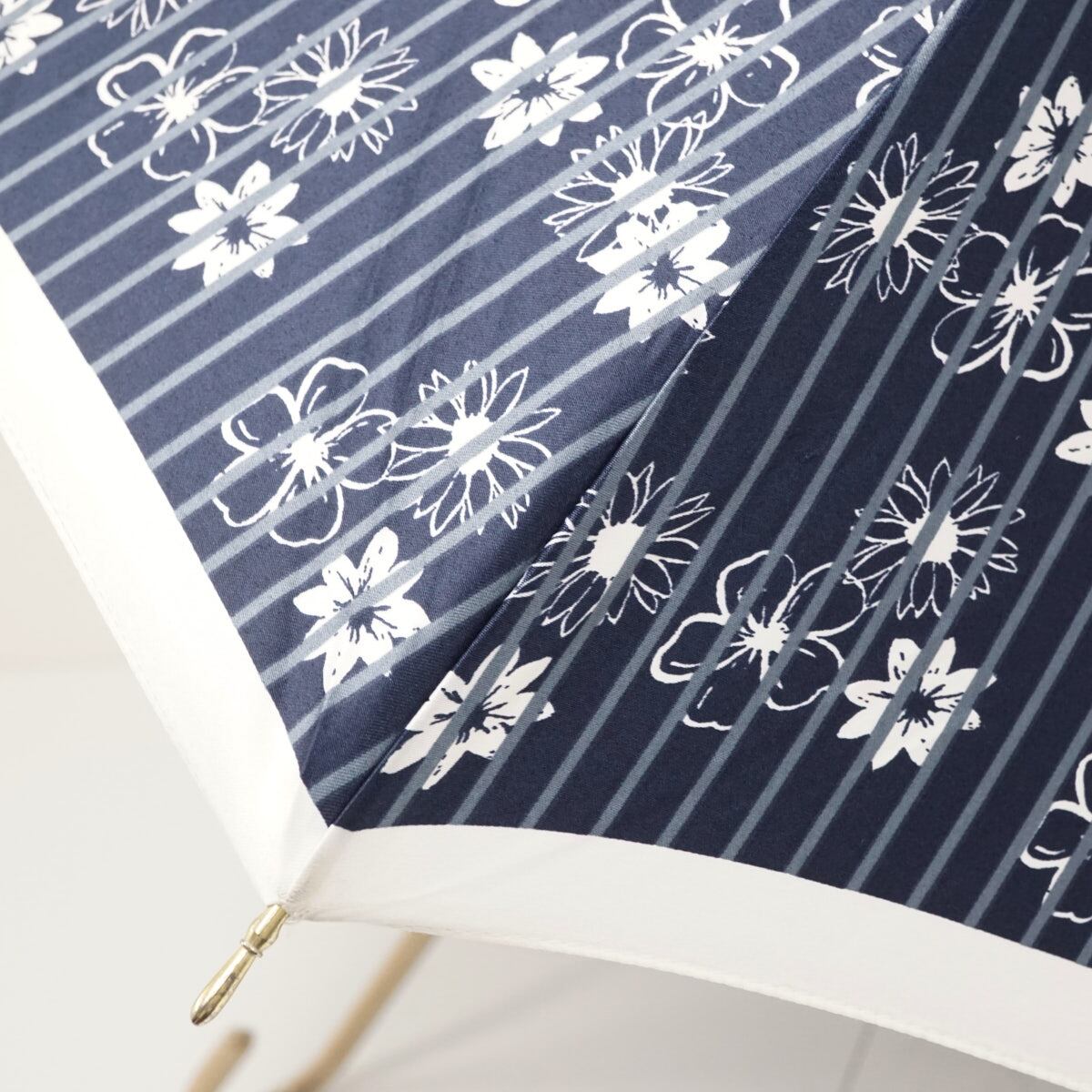 ネイビーをベースに、ストライプとフラワーを重ねてデザインした「ランバンオンブルー」のアンブレラです。