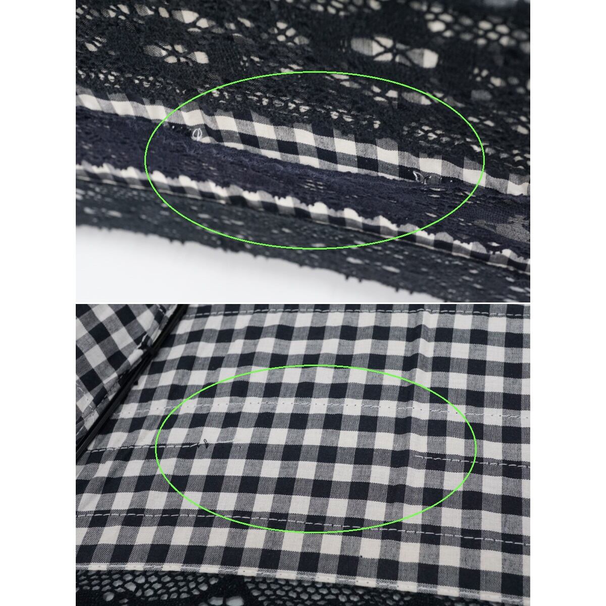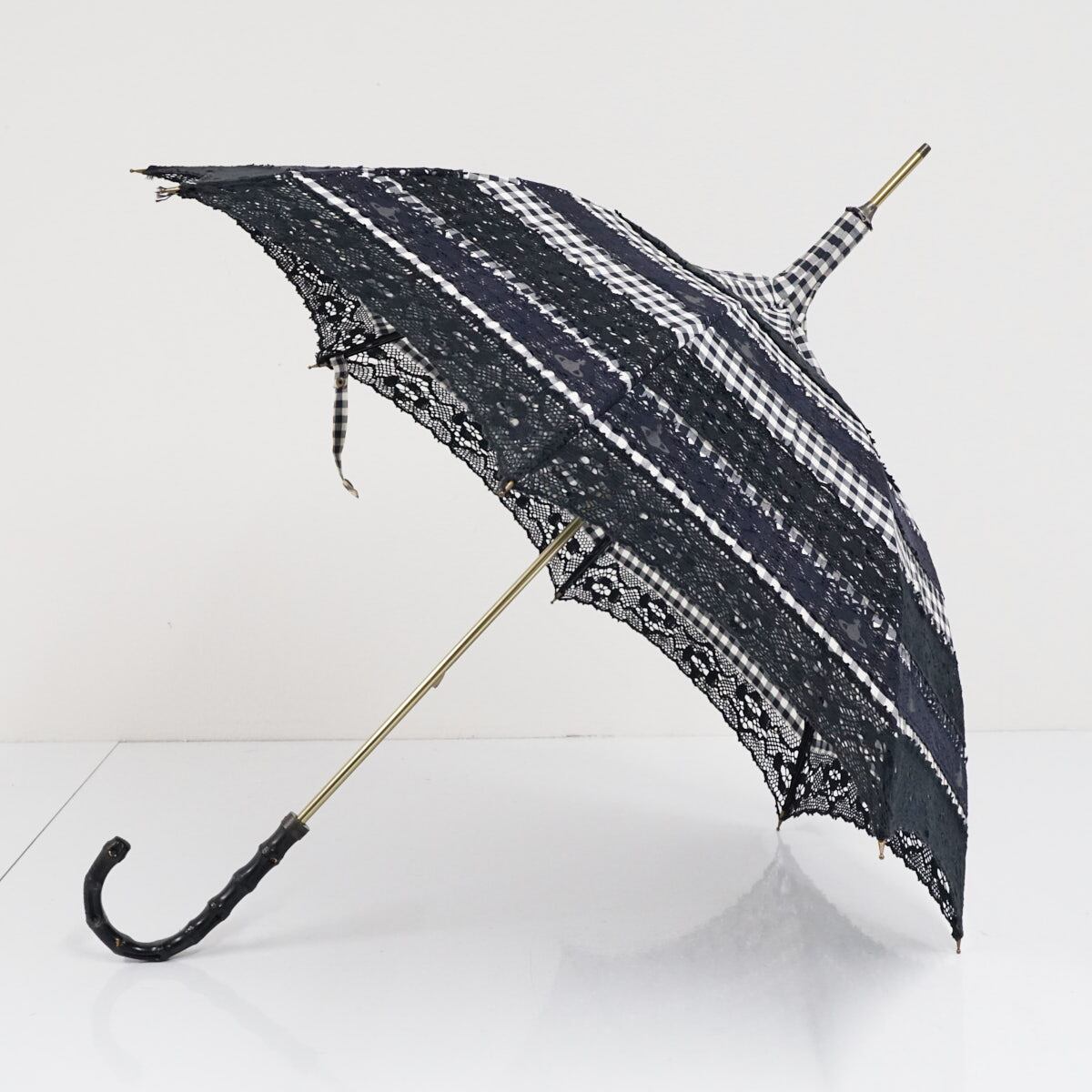 ブラック×ホワイトのギンガムチェック生地に、2パターンのレースを重ねた贅沢な造りの一本です。