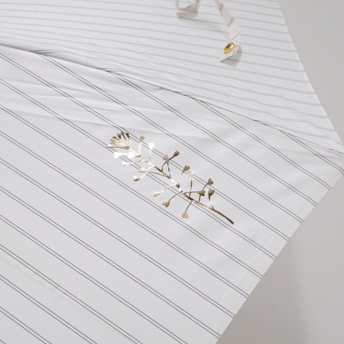 正面にはストライプの生地の上に、箔プリントがキラリと輝きます。