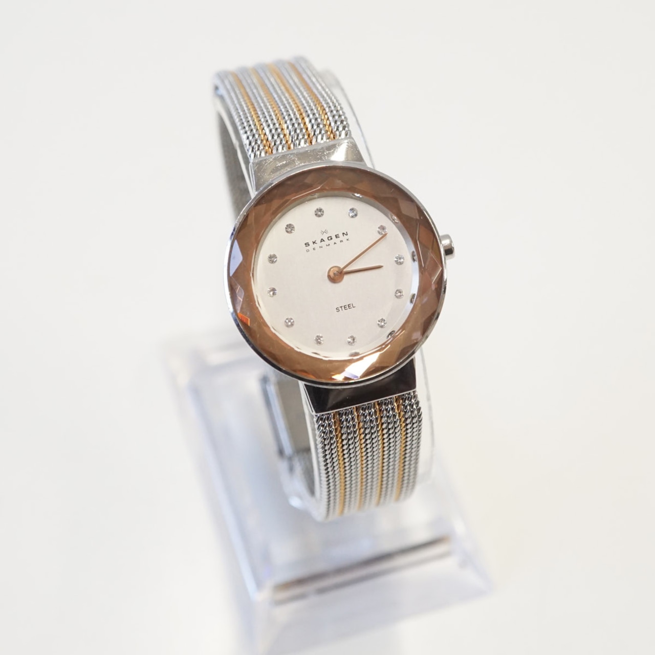 SKAGEN スカーゲン 腕時計 USED美品 456SRS1 レディース スワロフスキー エレガント シルバー ゴールド 完動品 中古 X6343