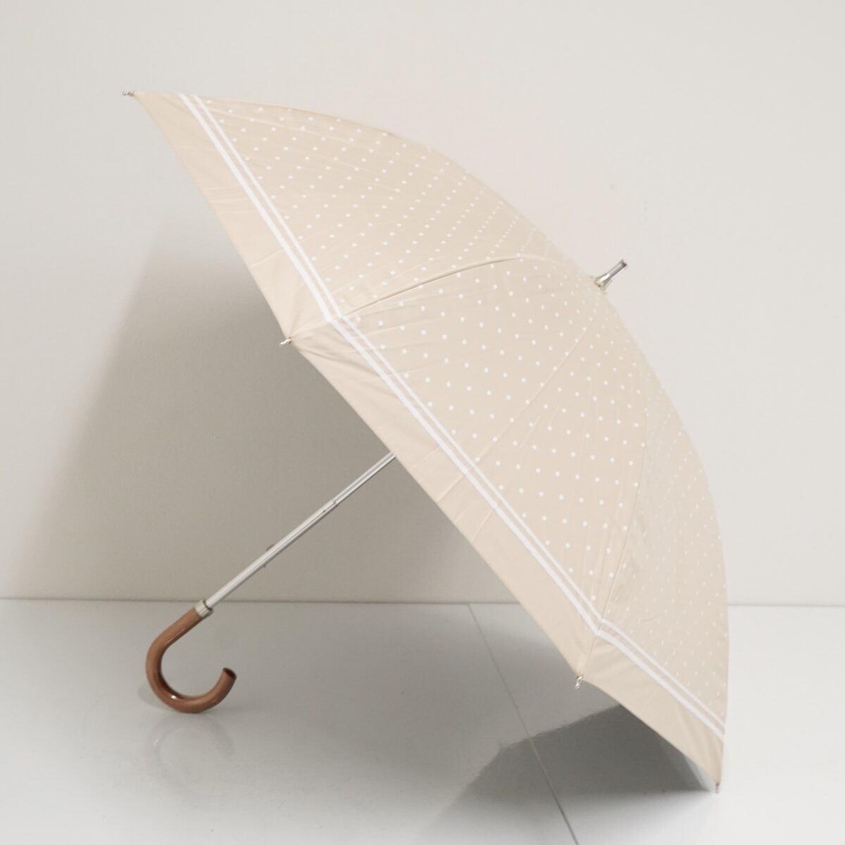 ベージュxホワイトの上品なカラーで、ドットとボーダーを組み合わせたクラシカルなデザインのパラソルです。